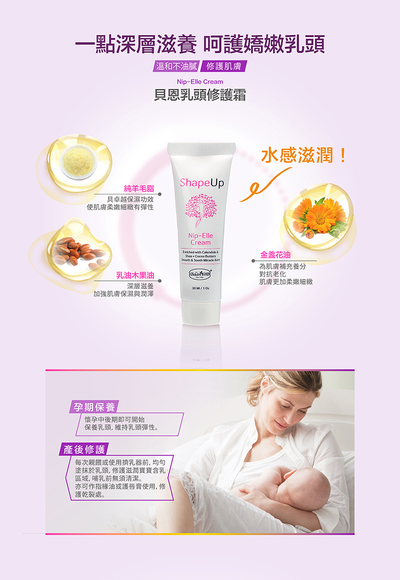 一點深層滋養,呵護嬌嫩乳頭!懷孕中後期、哺乳期使用,加強滋養、維持乳頭彈性。