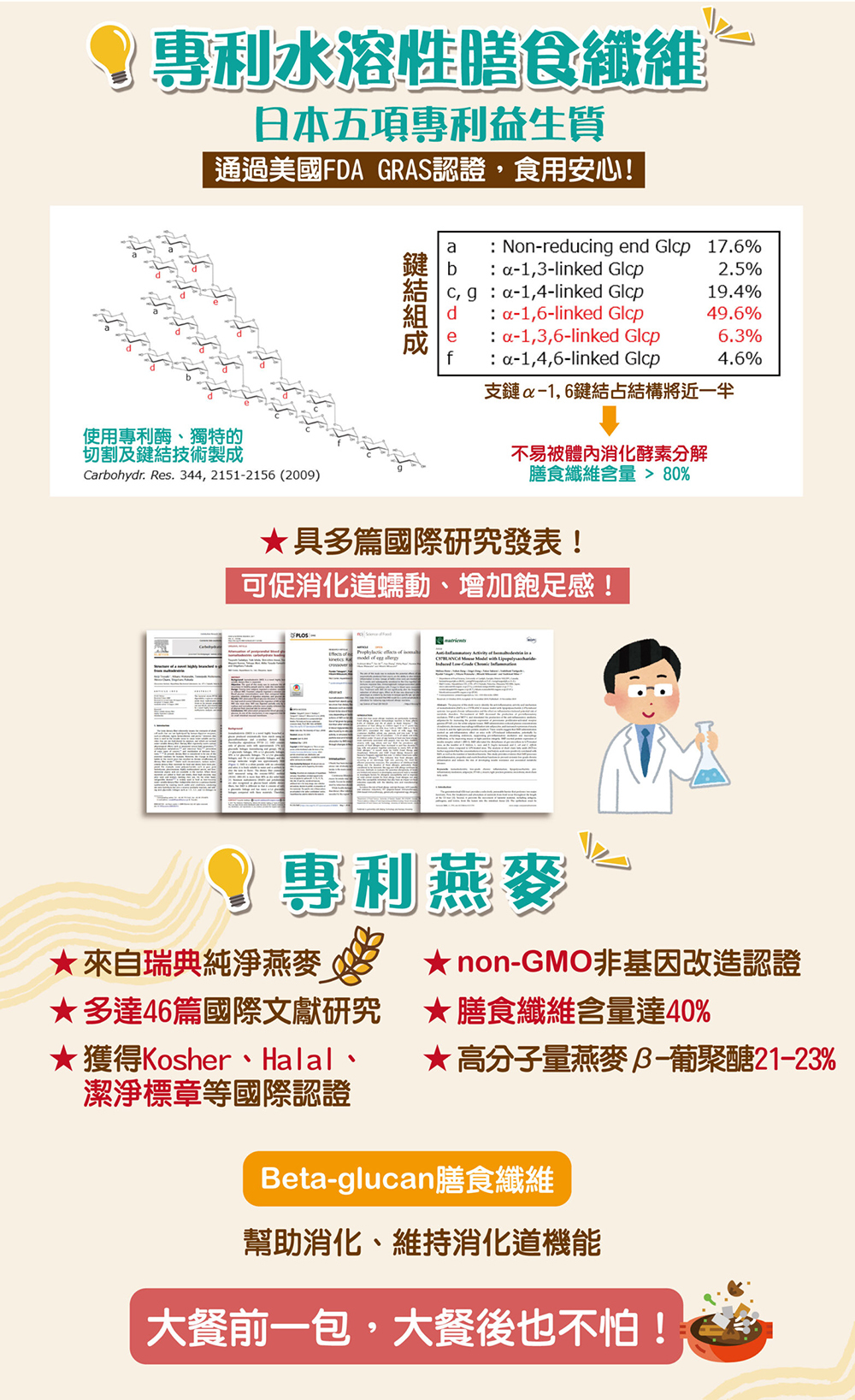 | ● | 專利燕麥,高膳食纖維,幫助消化、維持機能 |