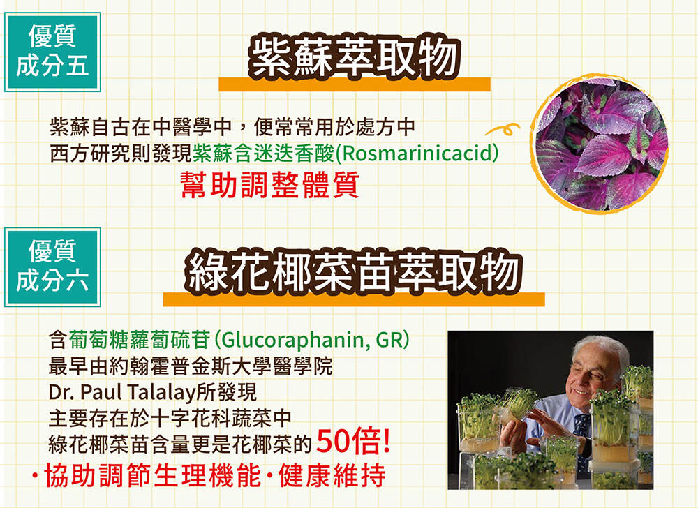 | ● | 綠花椰菜苗萃取物,協助調節生理機能 |