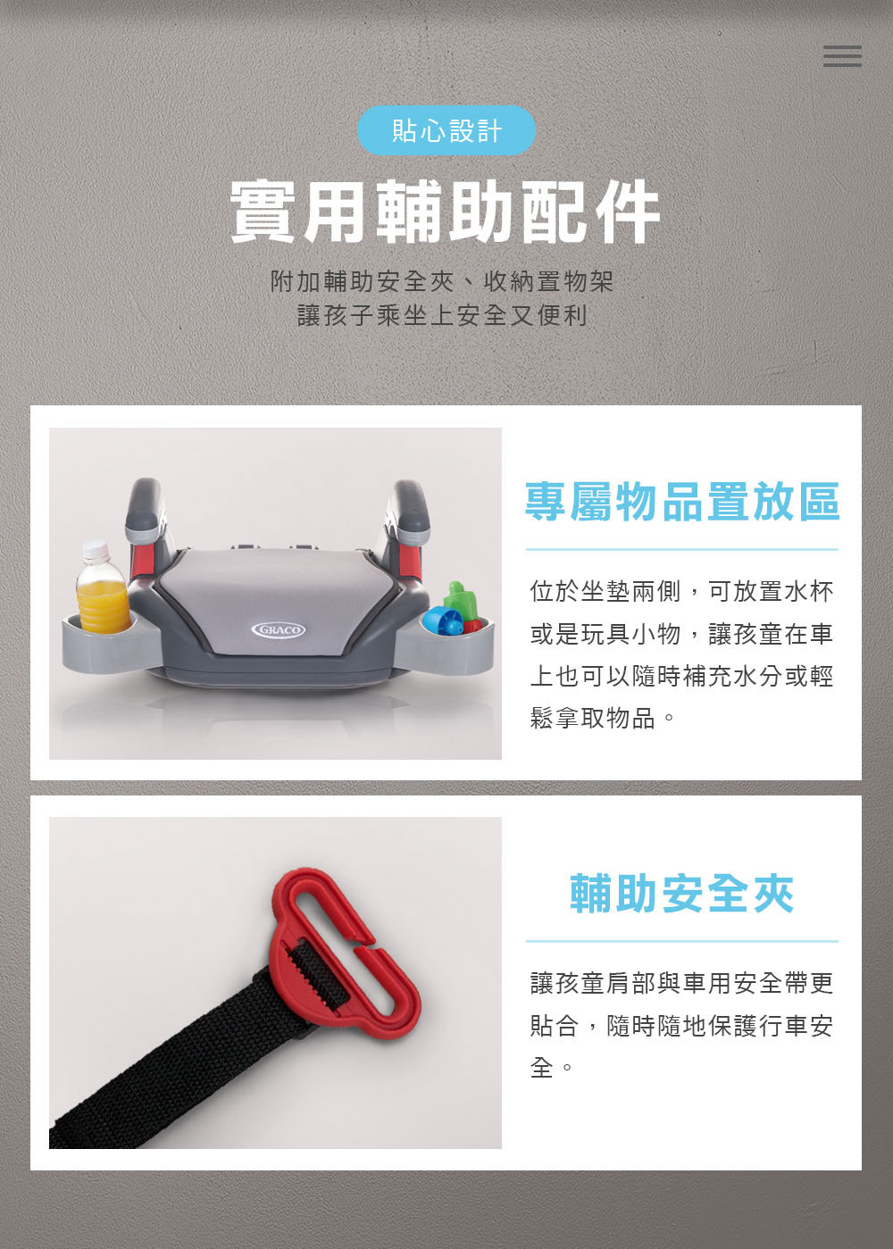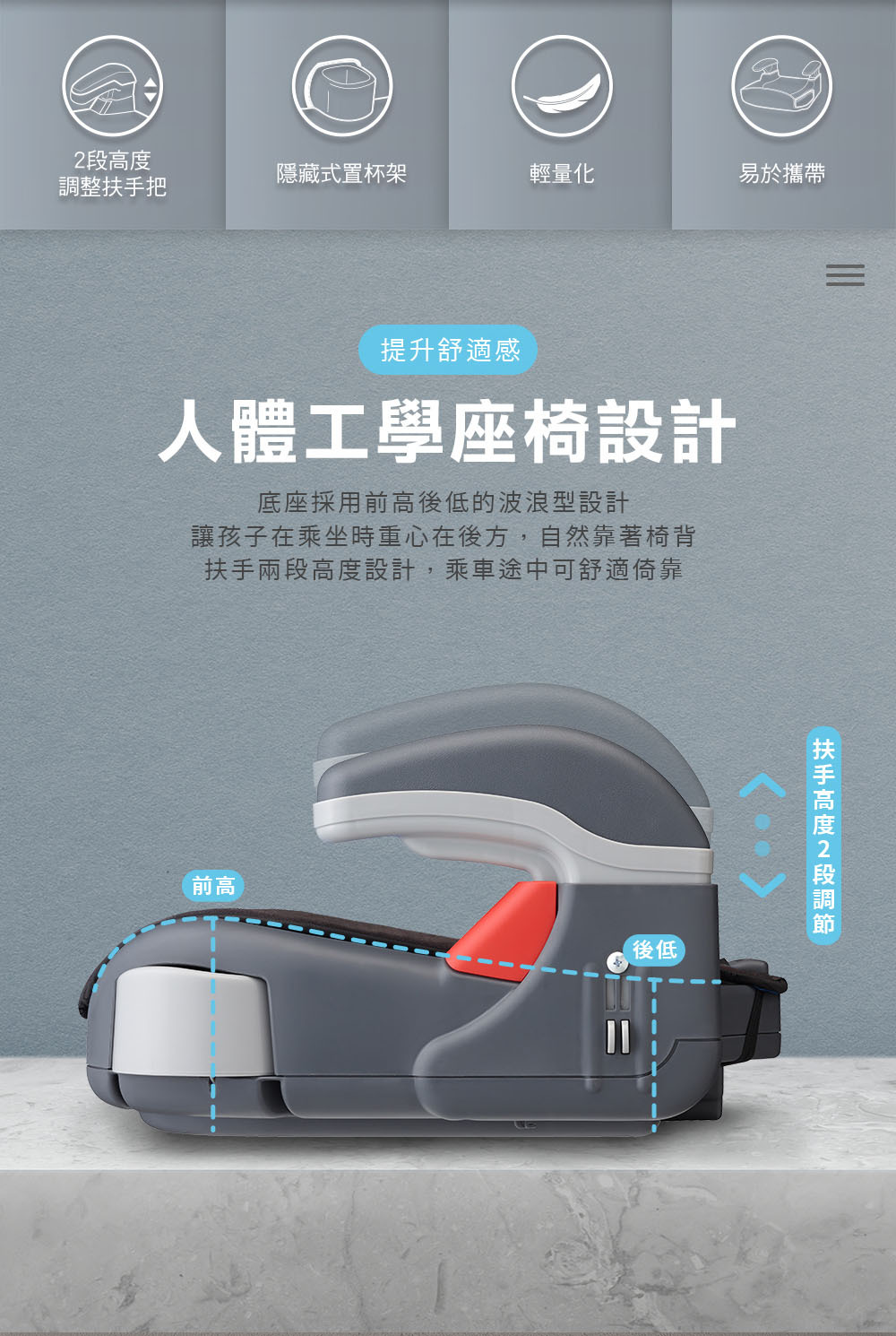 搭配車用三點式安全帶使用,保護孩童行車安全 |