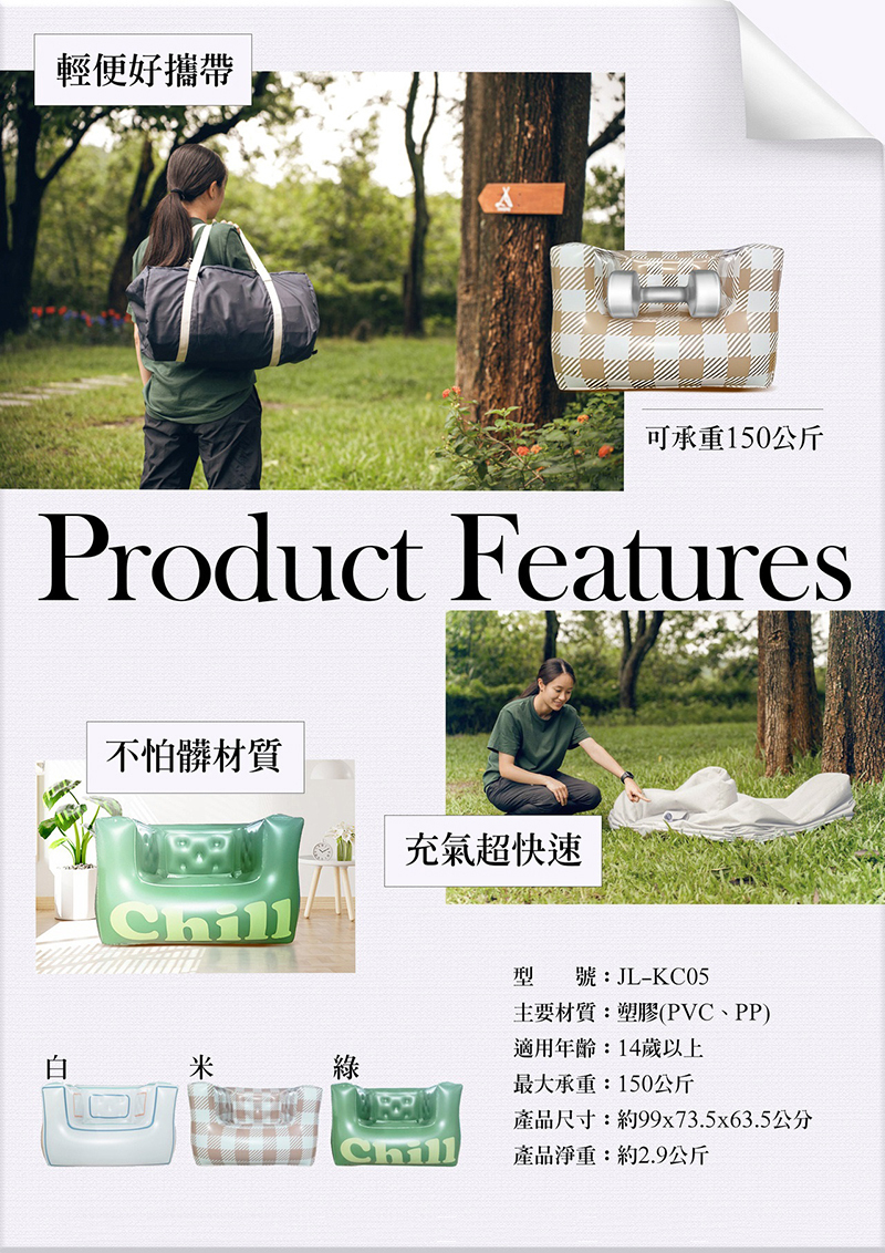 載重150公斤,快速充氣不怕髒,輕便好攜帶。