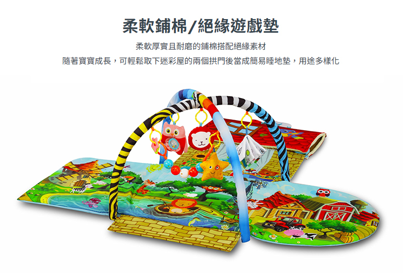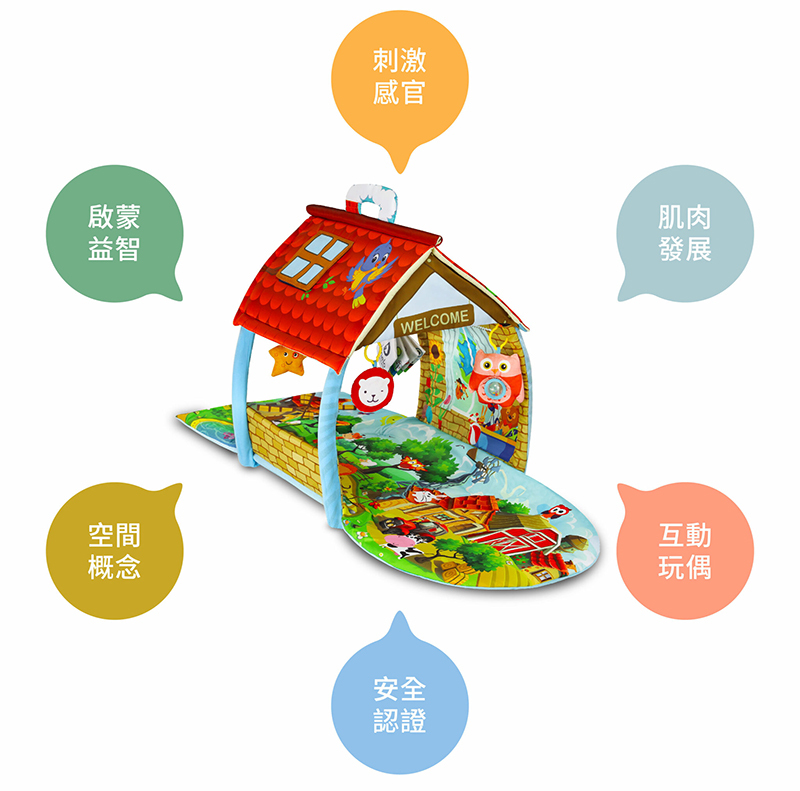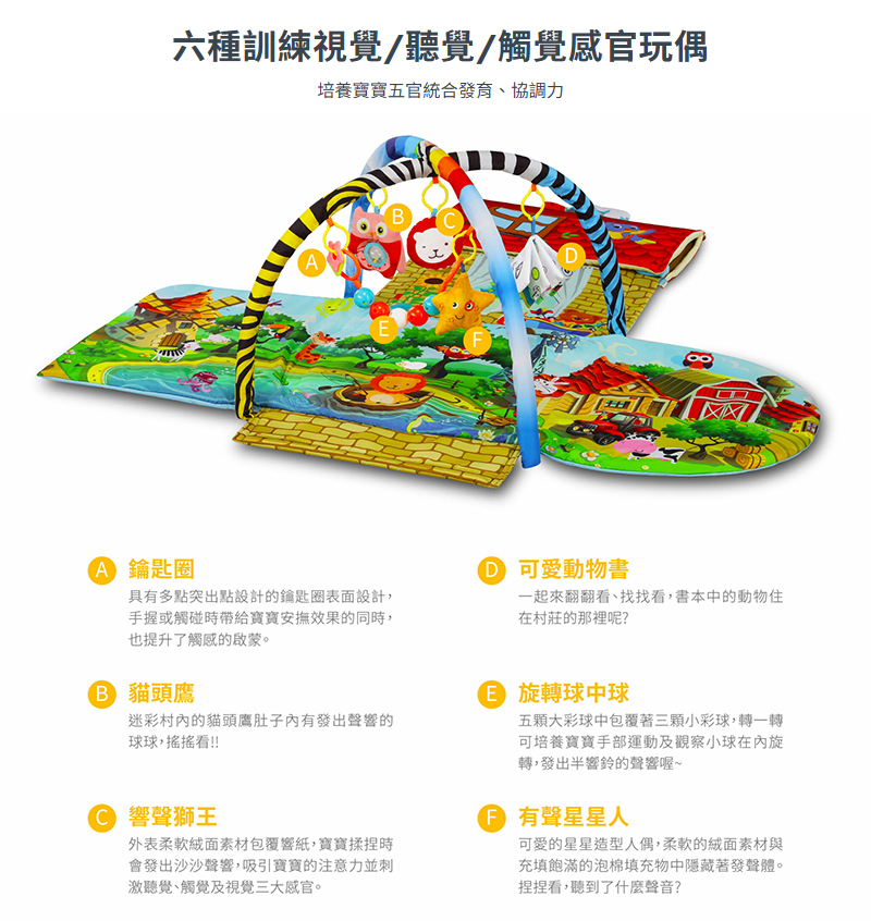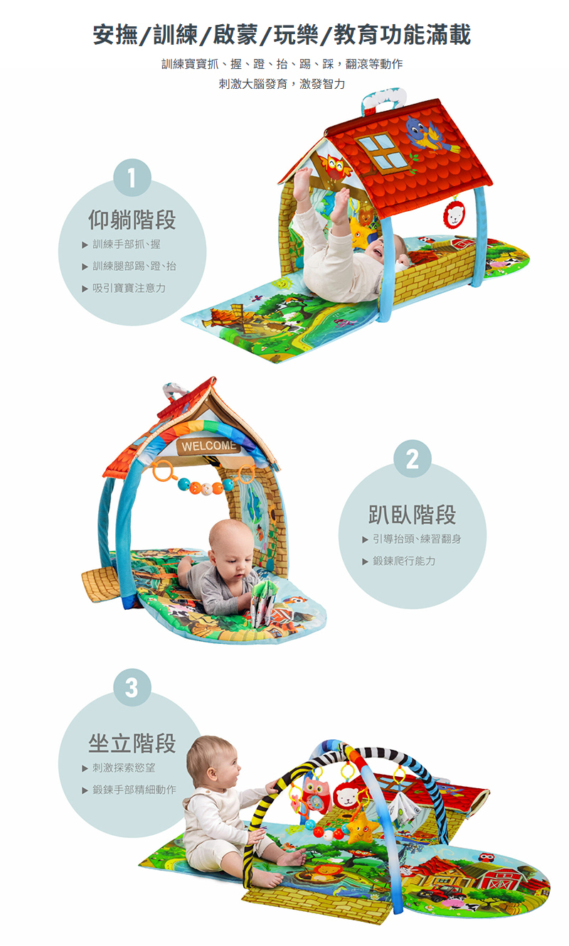 安撫/訓練/啟蒙/玩樂/教育功能滿載!訓練寶寶抓、握、蹬、抬、踢、踩,翻滾等動作,刺激大腦發育,激發智力。