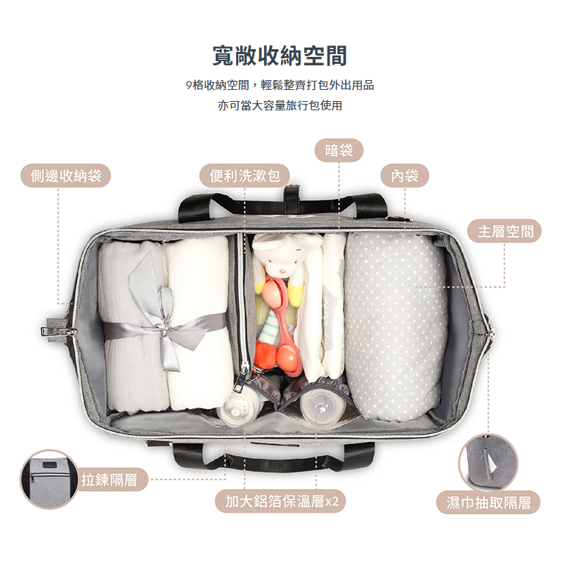 媽媽包也要時尚!9隔層設計、23cm寬廣型大開口,超大收納空間!完美支援大人小孩外出需求。