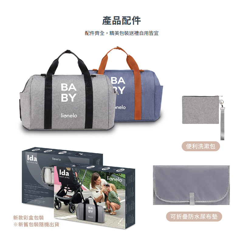 附贈配件 ➤ 可折疊防水尿布墊、便利洗漱包、時尚肩揹帶、嬰兒車固定吊掛帶、防塵收納袋