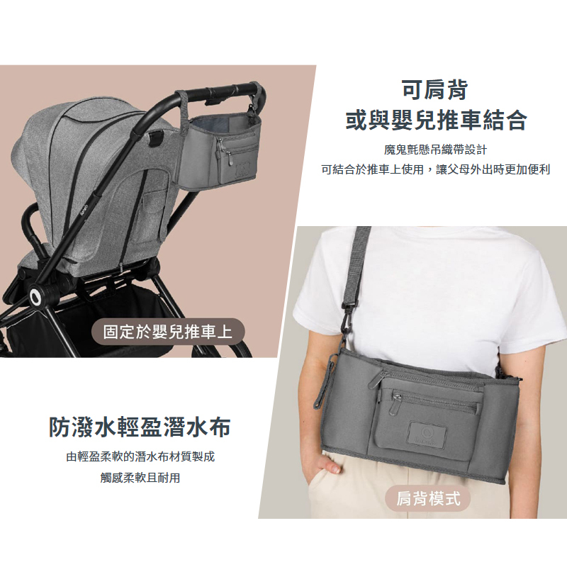 育兒也要時尚!分區收納一目瞭然、方便拿取,魔鬼氈懸吊織帶設計,可結合於推車上使用,讓父母外出時更加便利