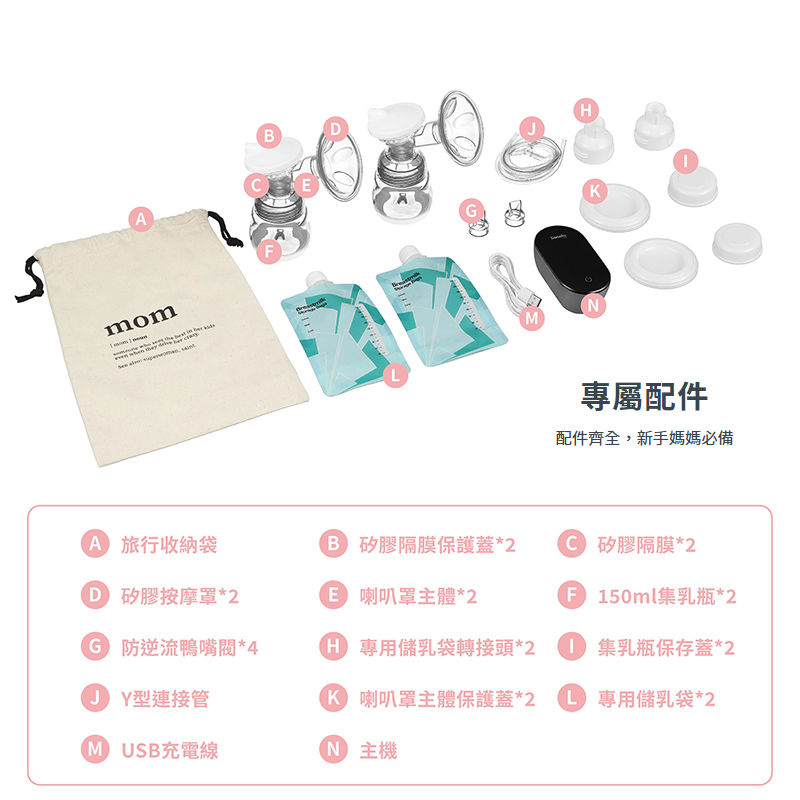 附贈配件 ➤ 150ml集乳瓶*2、集乳瓶保存蓋*2、專用儲乳袋*2、專用儲乳袋轉接頭*2