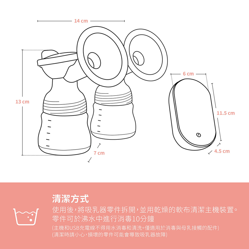 矽膠隔膜保護蓋*2、Y型連接管、防逆流鴨嘴閥*4、USB充電線、旅行收納袋