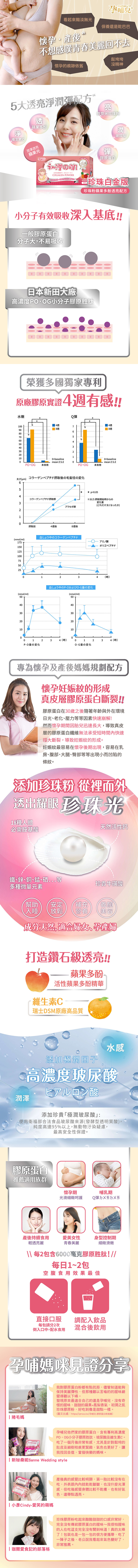 成分    ➤ 專利魚膠原蛋白胜肽粉末(含高濃度PO.OG膠原胜肽)、微奈米珍珠粉、維生素C、流行鏈球菌發酵物(含透明質酸鈉/玻尿酸)、蘋果皮萃取(含蘋果多酚)、鳳梨酵素