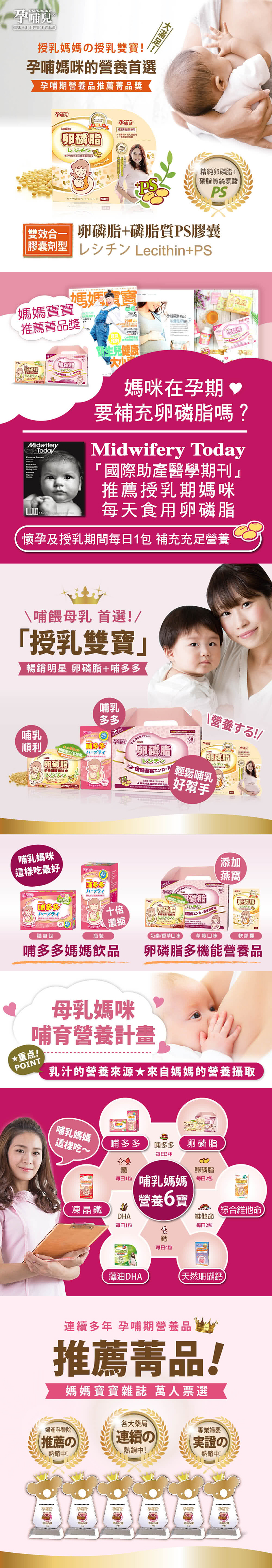 孕哺媽咪輕鬆補充聰明元素,每粒含精純卵磷脂800mg與PS磷脂質絲胺酸20mg,雙效合一,媽咪哺乳好輕鬆,寶寶聰明起跑更加分。
