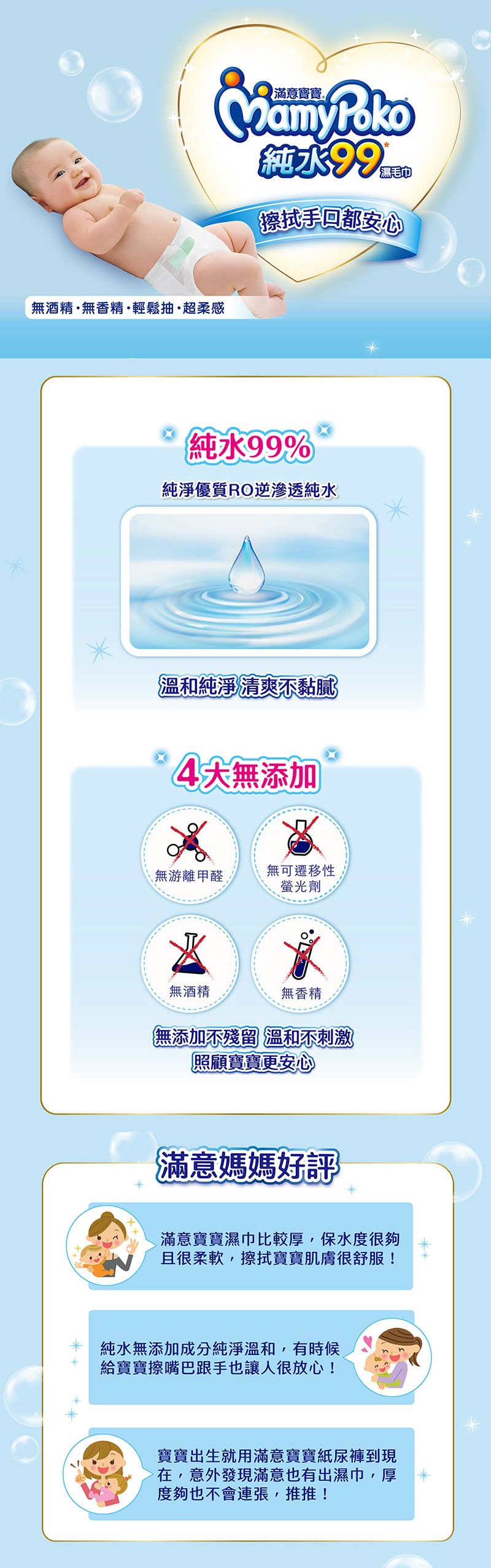 純水99配方擦拭手口都安心。無香精、螢光劑添加不刺激寶寶肌膚,特製剪裁折法張張俐落好抽不黏張。