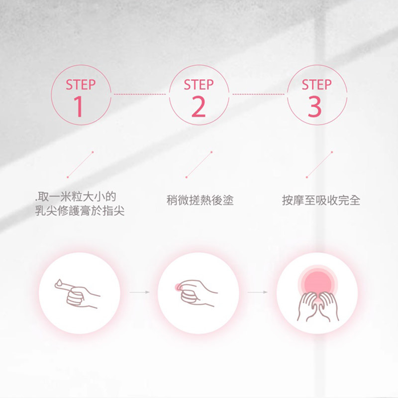 使用方式  ➤ 將乳尖修護膏放在手掌間,讓修護膏有些溫度會更容易塗抹。寶寶出生後,媽咪可根據需要在親餵前後使用,使用時可搭配按摩乳尖和乳暈區域以幫助吸收
