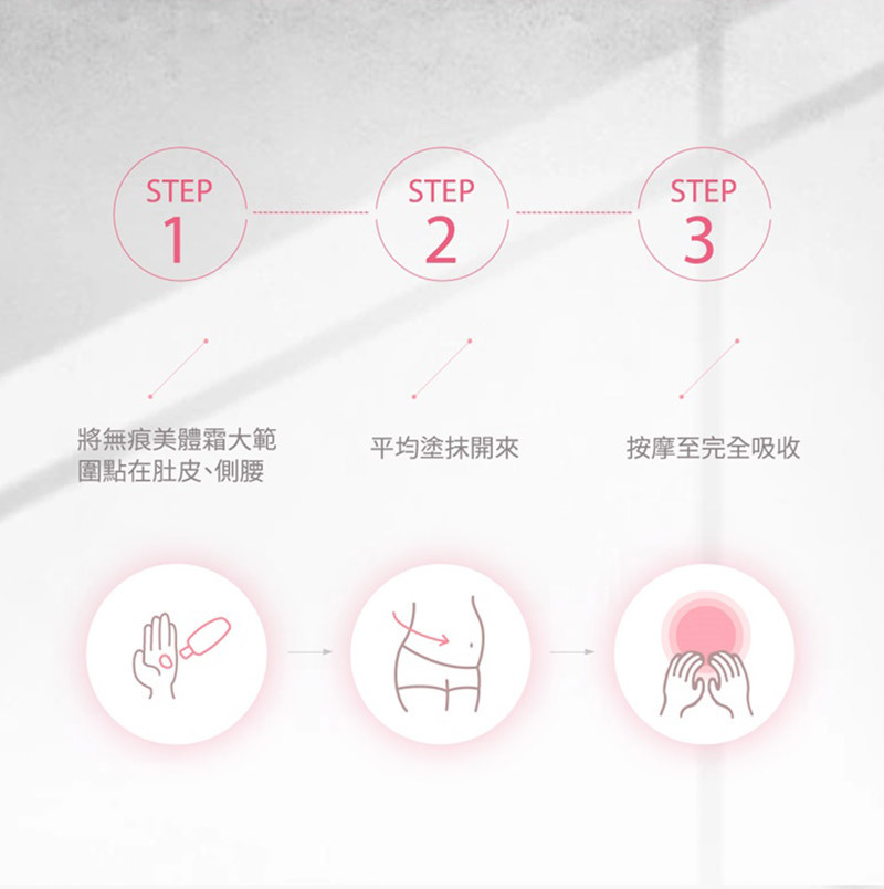 使用方式  ➤ 每天早晨與晚上使用在乾燥清潔的肌膚上,以手掌畫圓按摩與腹部、臀部、以及大腿處