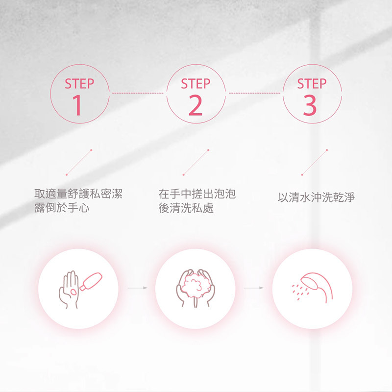 使用方式  ➤ 像沐浴乳一樣潔淨私密肌膚,再以清水沖洗即可。限外用,並避開傷口處