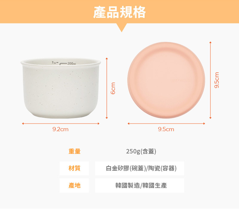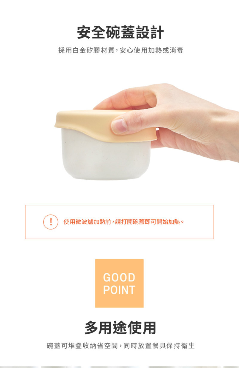 材質    ➤ 碗蓋:白金矽膠(-20~190℃)、容器:陶瓷