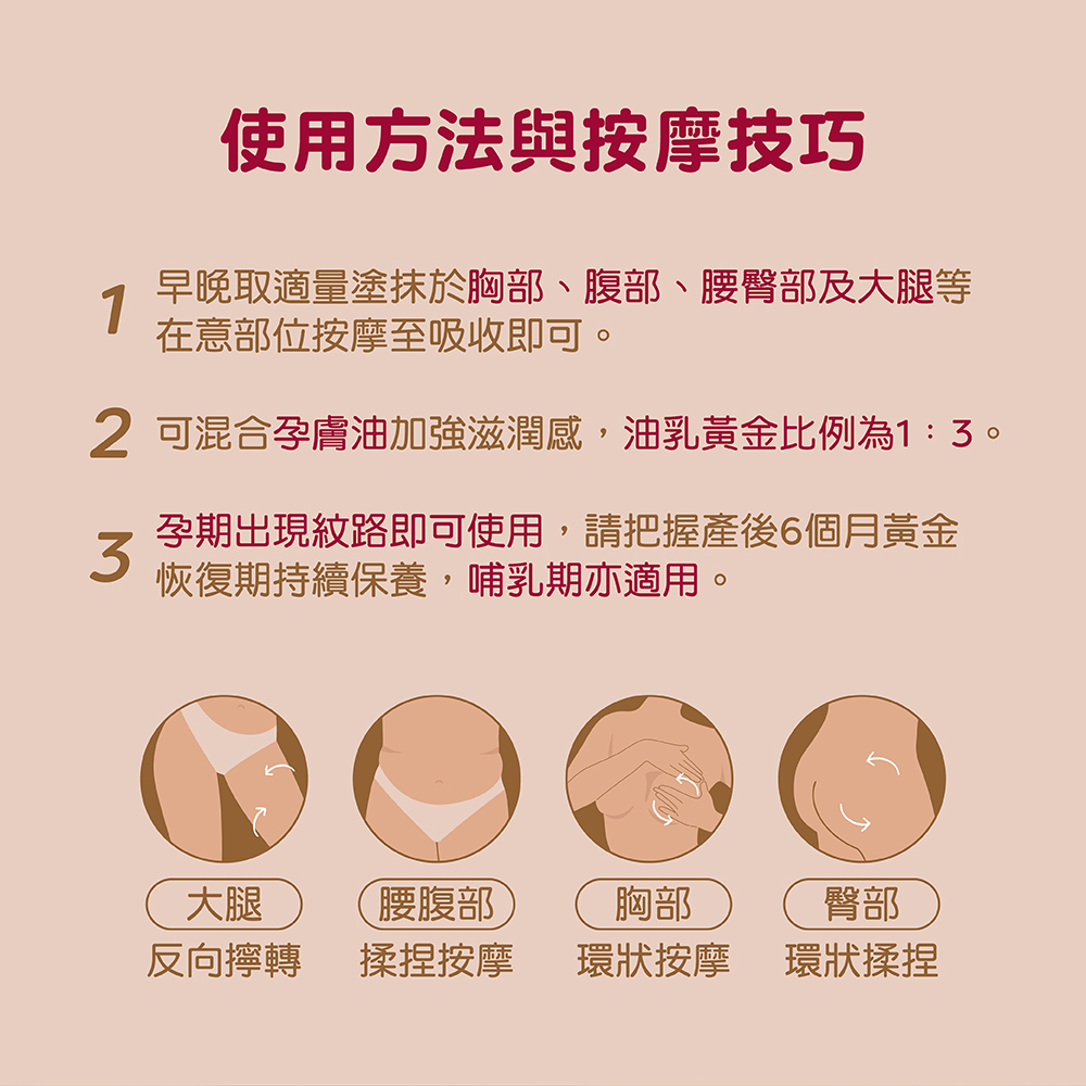 使用方法 ➤ 早晚取適量塗抹於胸部、腹部、臀部及大腿等在意部位,畫圈按摩至吸收即可。產後使用請至少持續8週。