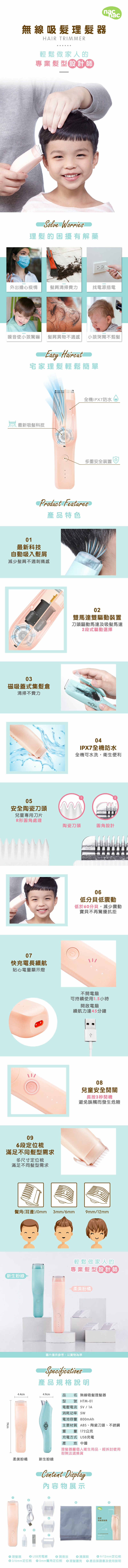 使用方式  ➤ 長按3秒開機,開機時可理髮,並無吸髮功能,指示白燈亮起。吸髮:短按1下開啟吸髮風扇,此時可同時理髮及自動吸髮屑功能。關機:再按一下即可關機。刀頭安裝:將刀頭連接A處放入機身B處卡槽;對準後用力按加刀背,聽到”喀噠”聲即完成。拆卸:主機電源關閉,用拇指按住刀頭的刀齒部位,沿箭頭所示方向用力推出,即可卸下刀頭。定位梳安裝:將定位梳所需長度朝上,對準刀頭兩側邊的卡槽,扣入,聽到”喀噠”聲即完成。拆卸:用手指將定位梳其中一側扣板輕輕向外拉開,即可取下。切勿硬拉梳齒導致毀損。