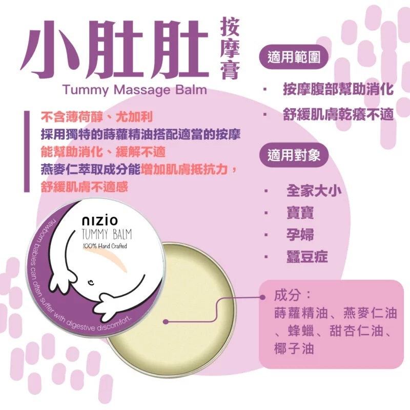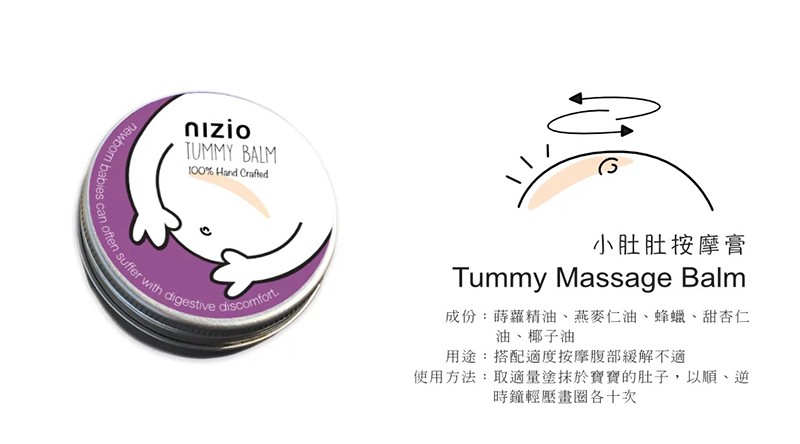 使用方法  ➤ 取適量塗抹於寶寶的肚子,以順、逆時鐘輕壓畫圈各十次