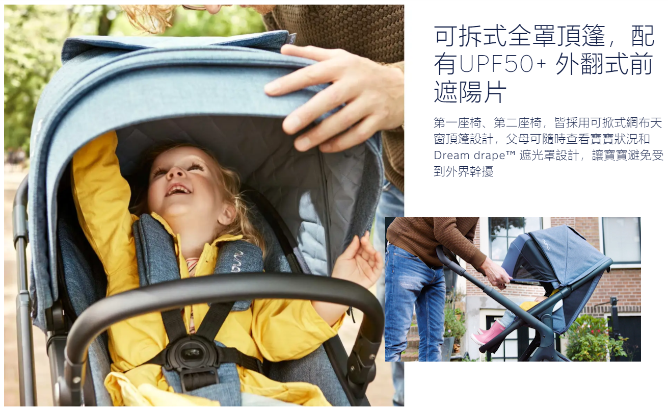第一座椅、第二座椅,皆採用可掀式網布天窗頂篷設計,父母可隨時查看寶寶狀況和Dream drape™ 遮光罩設計,讓寶寶避免受到外界幹擾 |