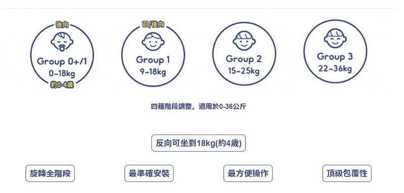 前向使用時:Group 1(9-18公斤)狀態/背靠最躺120度,最挺95度