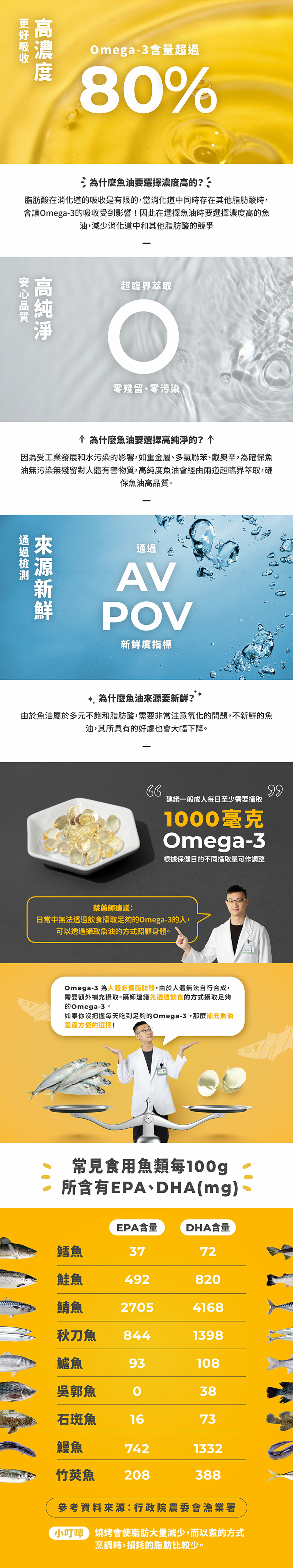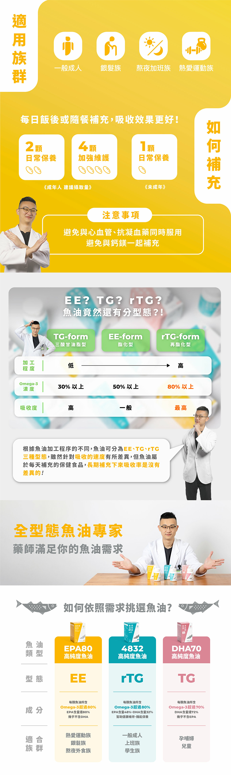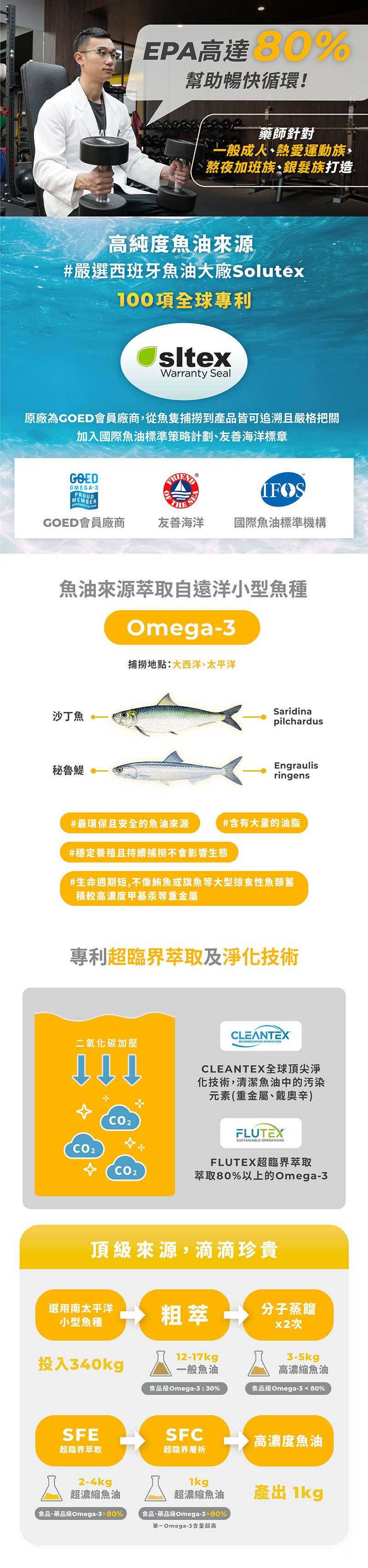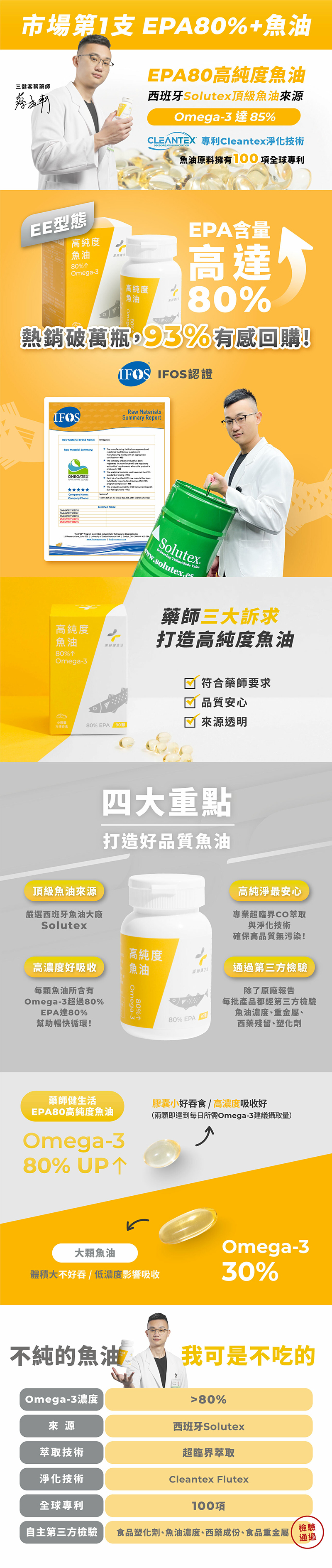 成分 ➤ 魚油(總Omega-3 85%、EPA 80%、DHA 0.2%)、維生素E(抗氧化劑)