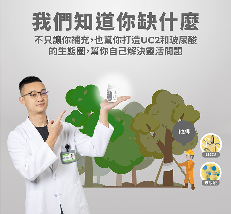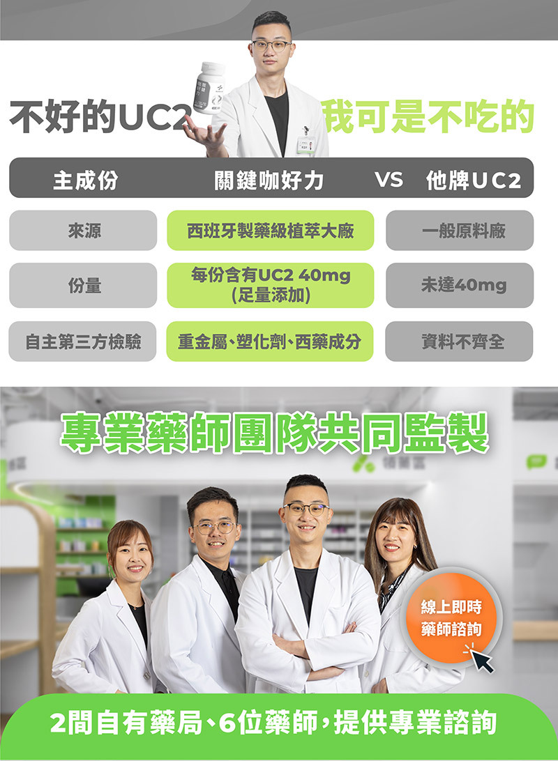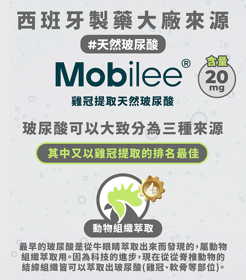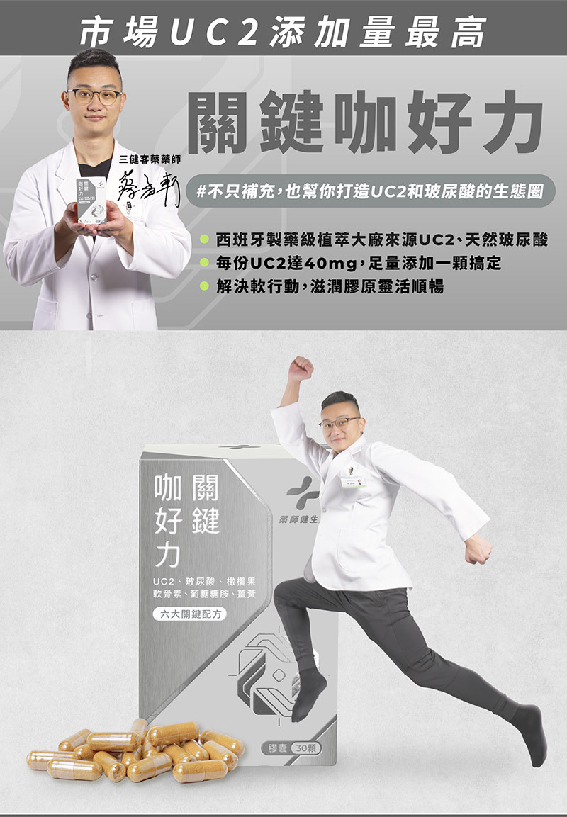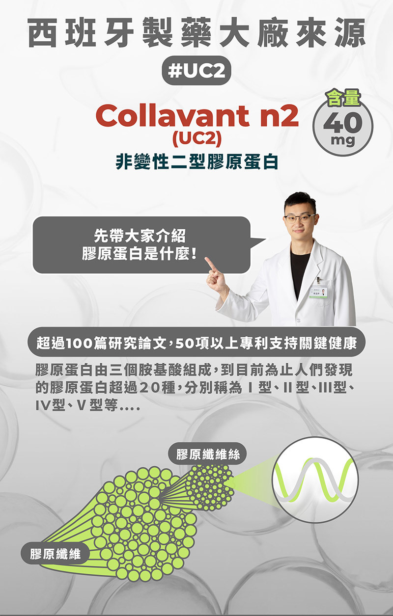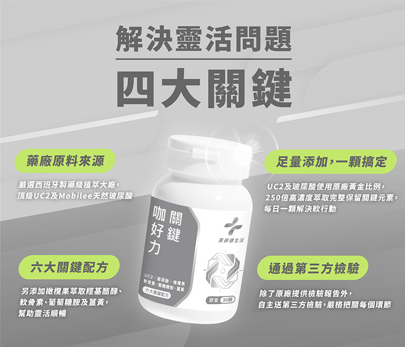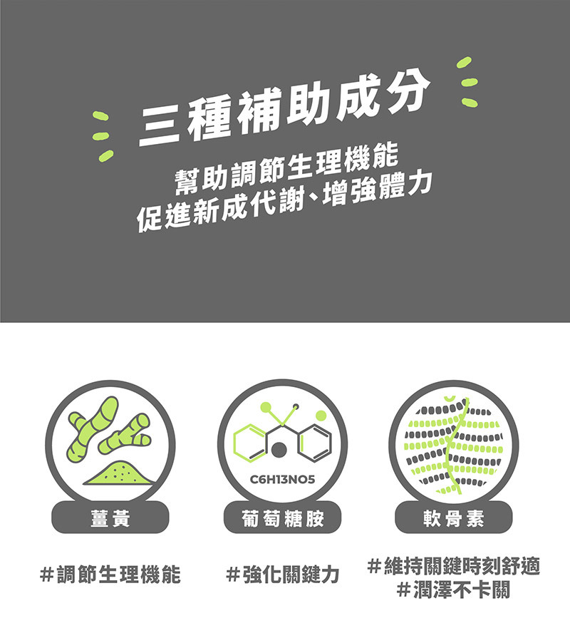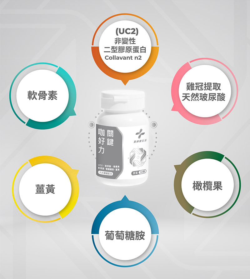 成分 ➤ 葡萄糖胺鹽酸鹽、薑黃、豬軟骨素、橄欖果萃取物(含羥基酪醇)、麥芽糊精、橄欖果萃取物、磷酸鈣、雞胸軟骨萃取物(非變性二型膠原蛋白)、雞冠萃取物(含透明質酸鈉)