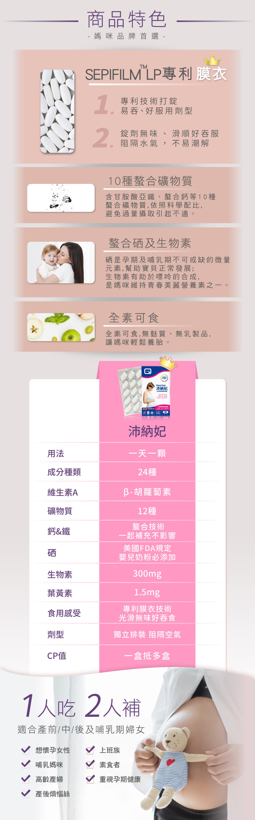 | ● | 葉酸、B群、鈣、葉黃素等24種全方位營養素 |
