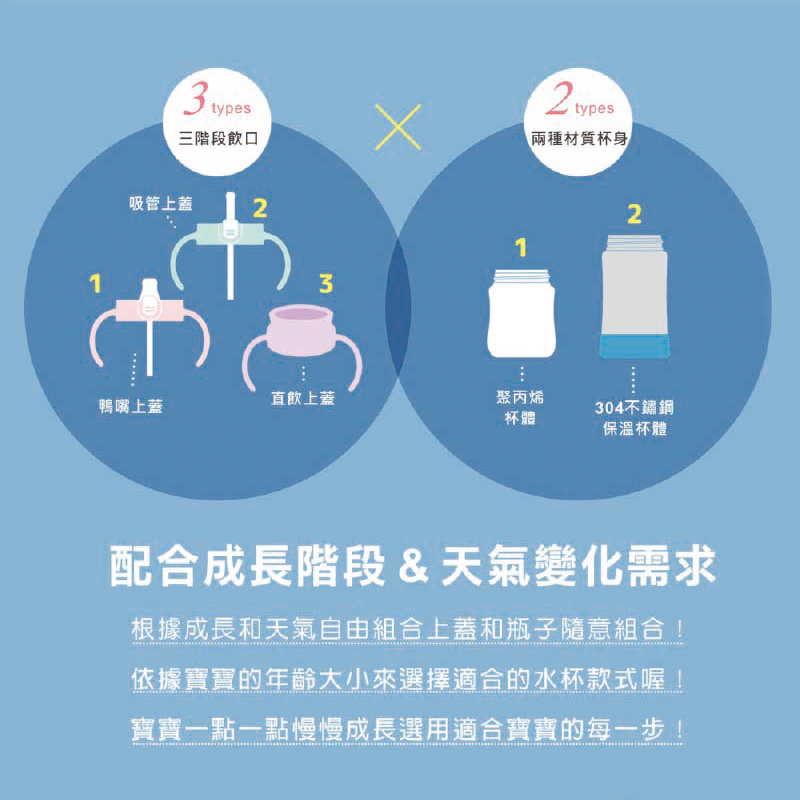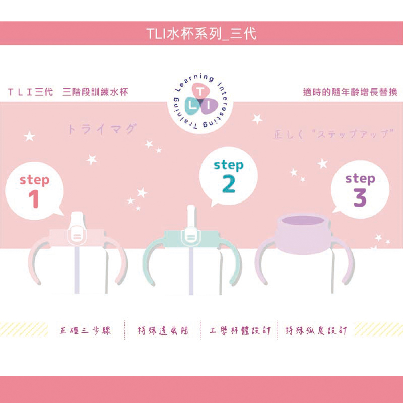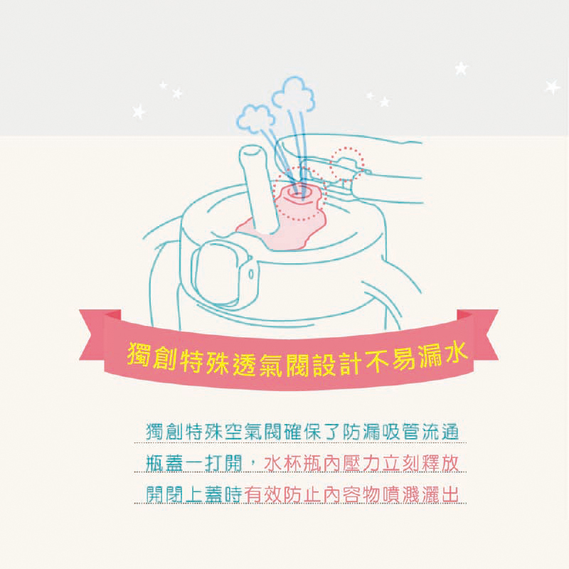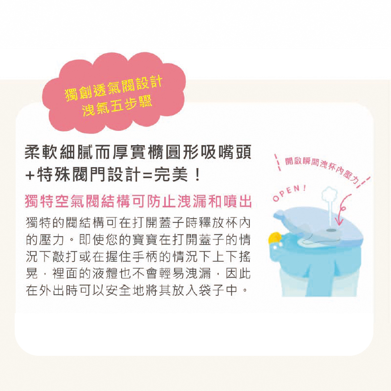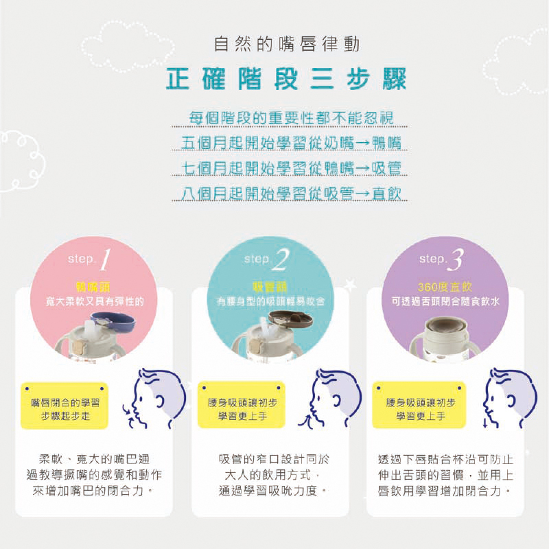 360°任何角度都可喝水,學習增加閉合力 材質輕量,握把設計讓寶寶更易於拿握 |