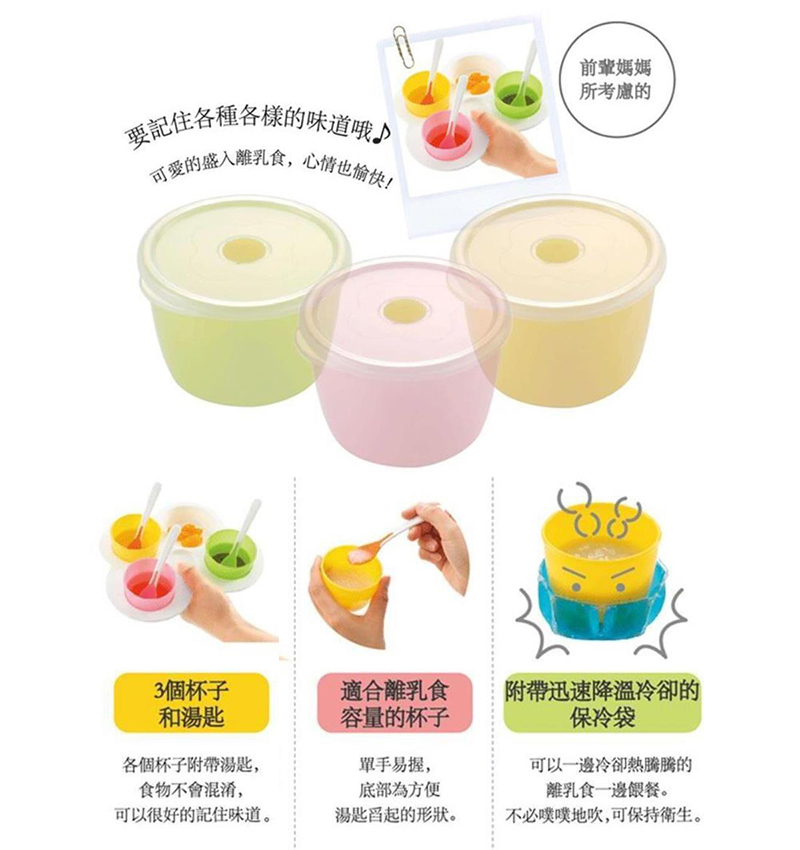 內容物 ➤ 餐盤x1、杯子(含蓋)x3、湯匙x3、保冷袋x1