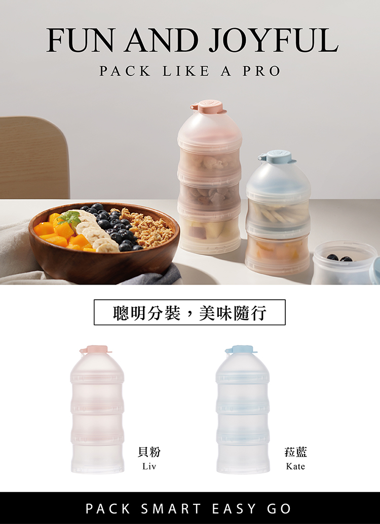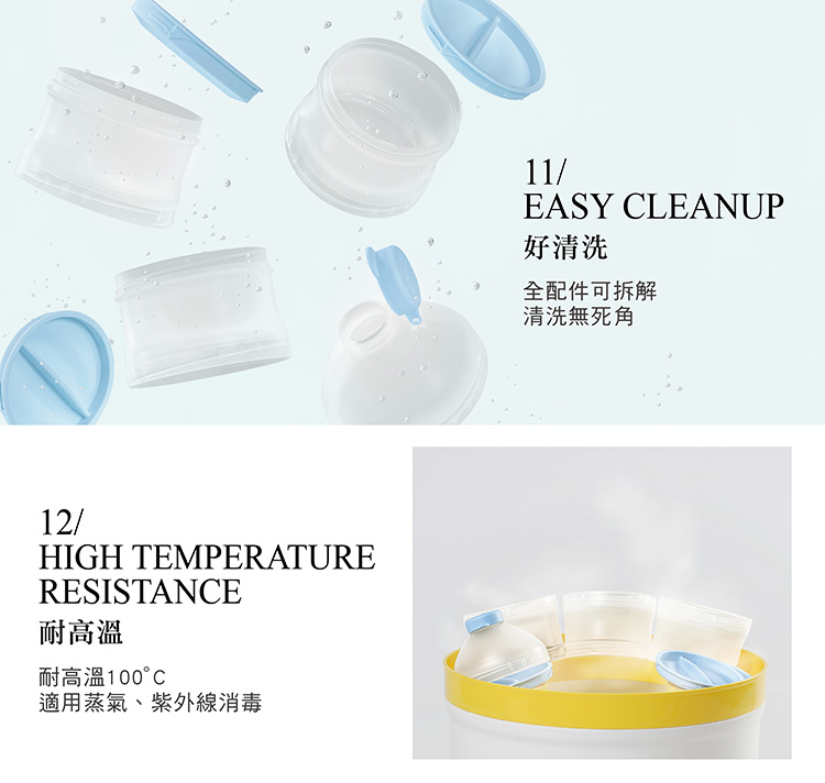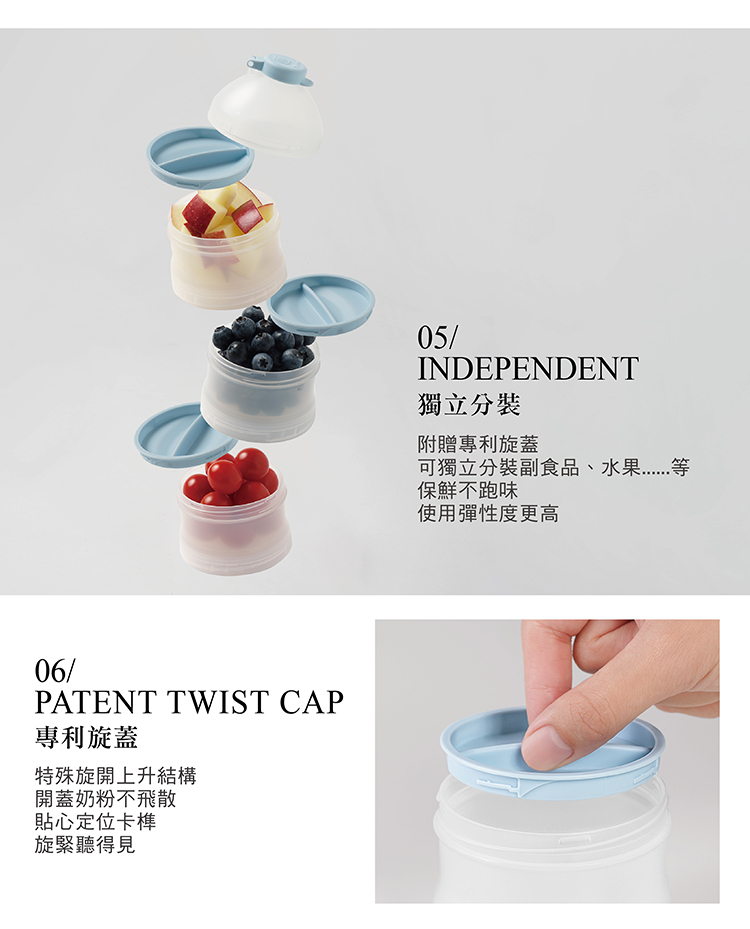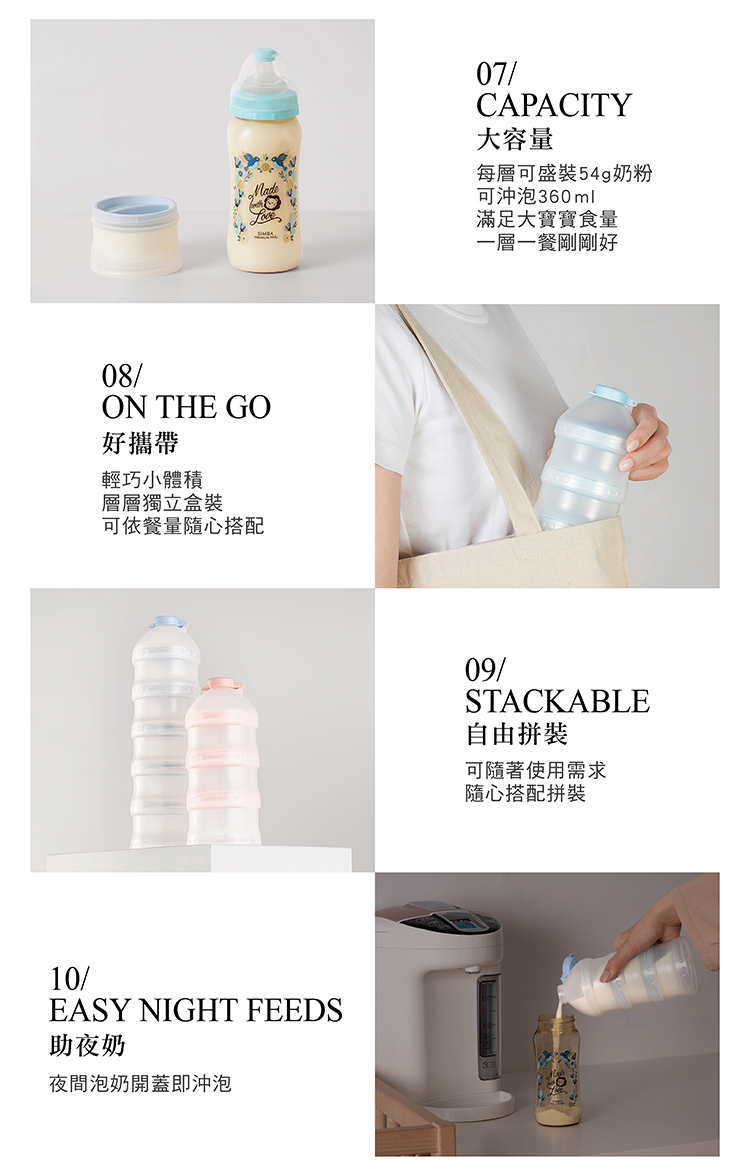 規格    ➤ 每層約54g奶粉量(1匙=約4.5g,可裝12匙),可沖泡360ml奶水量或米粥水120g
