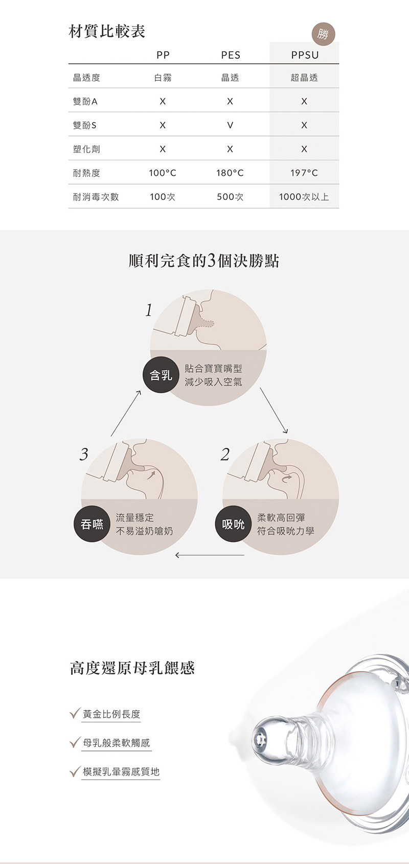 100%台灣製造,為新生兒打造白金級奶嘴,擬造媽媽乳房觸感。 |