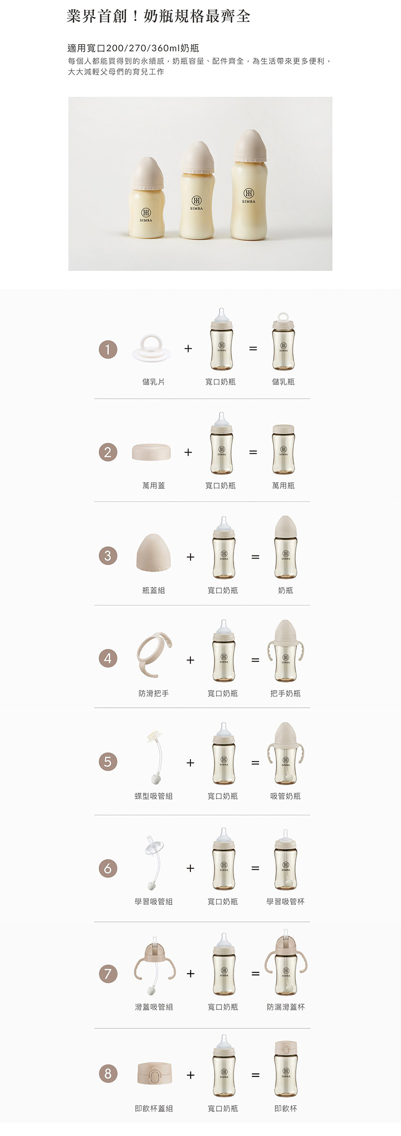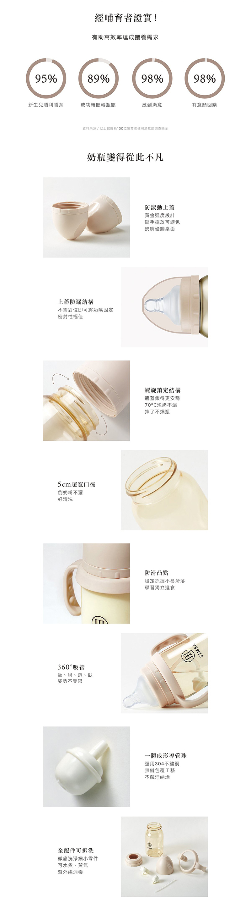 獨家首創一瓶八用!分階段科學餵養:儲乳、餵乳、學飲。 |