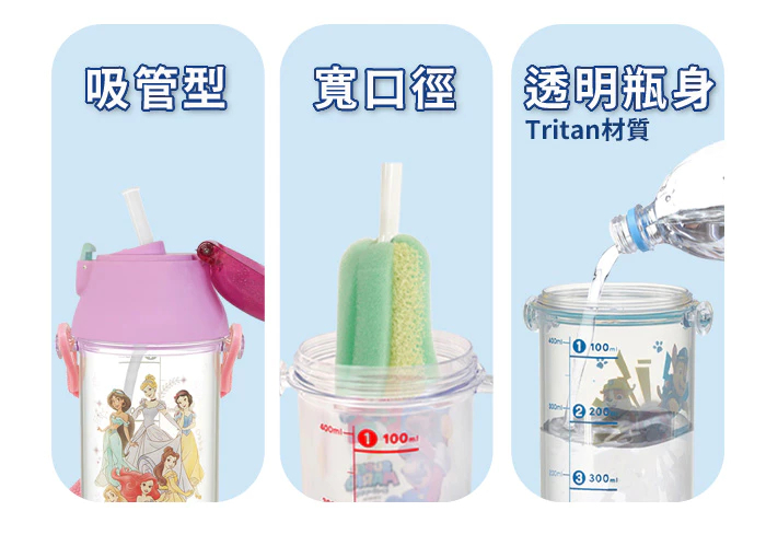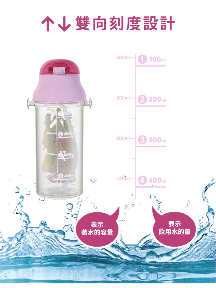 含有水量刻度的透明瓶身,方便查看瓶內水量,彈蓋式開口設計 |