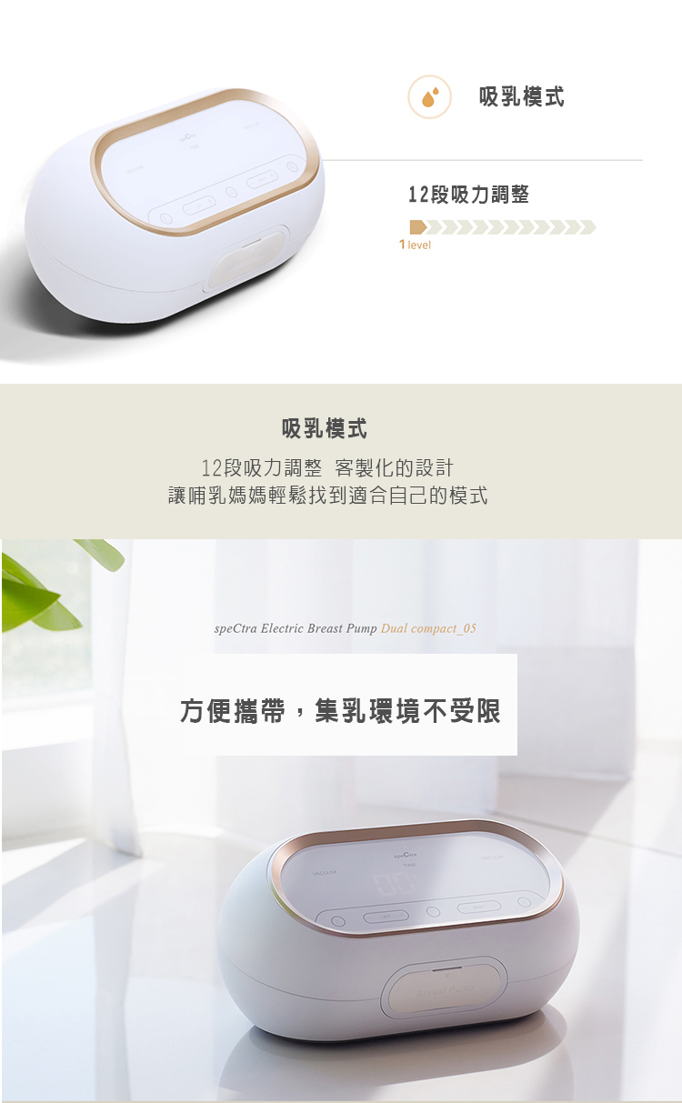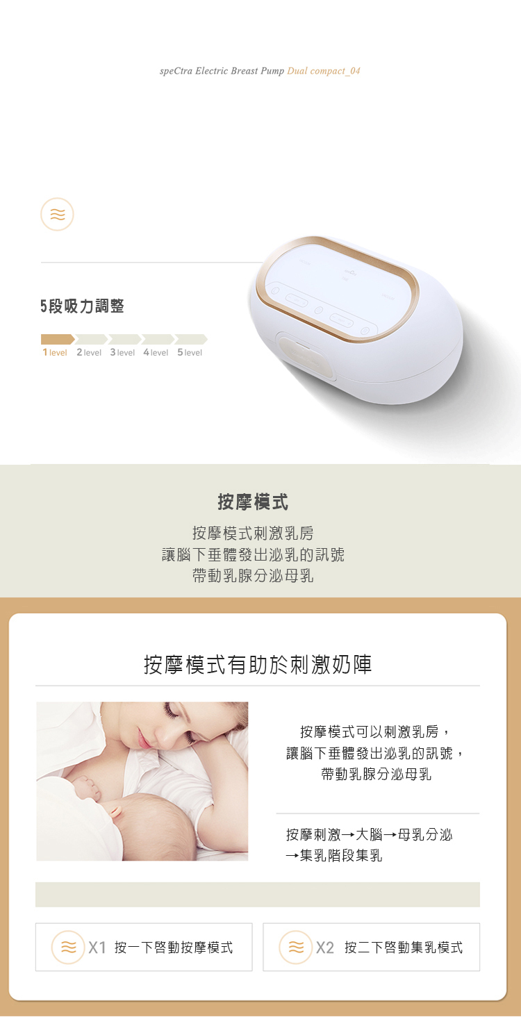 5階段按摩吸力、12階段集乳吸力