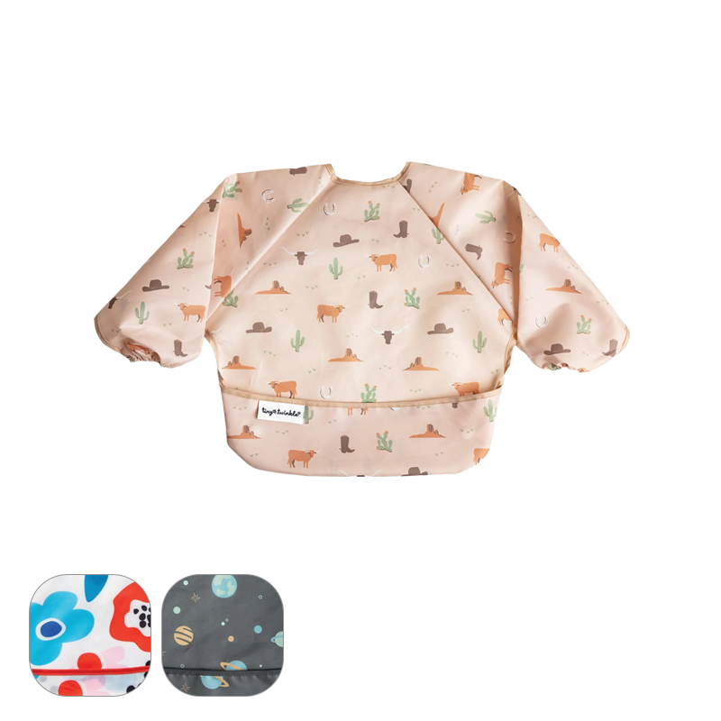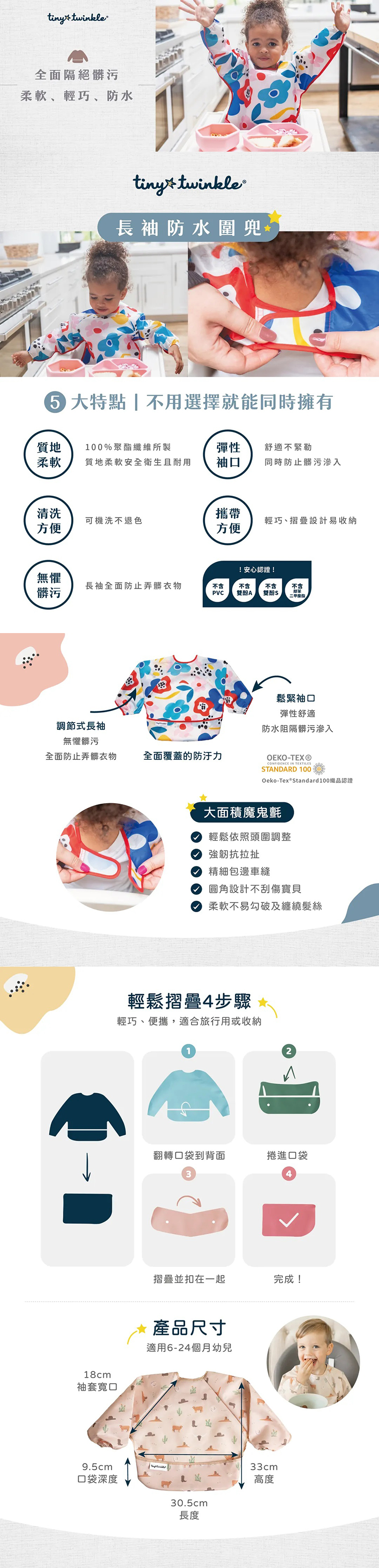 舒適材質,柔軟、輕巧、防水,長袖全面防止弄髒衣物。