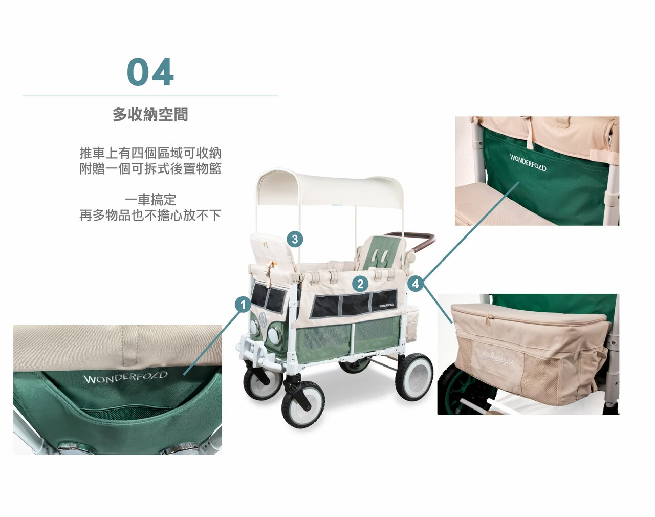 | ● | 充足收納空間,包含多處收納袋及可拆式後置物籃 |