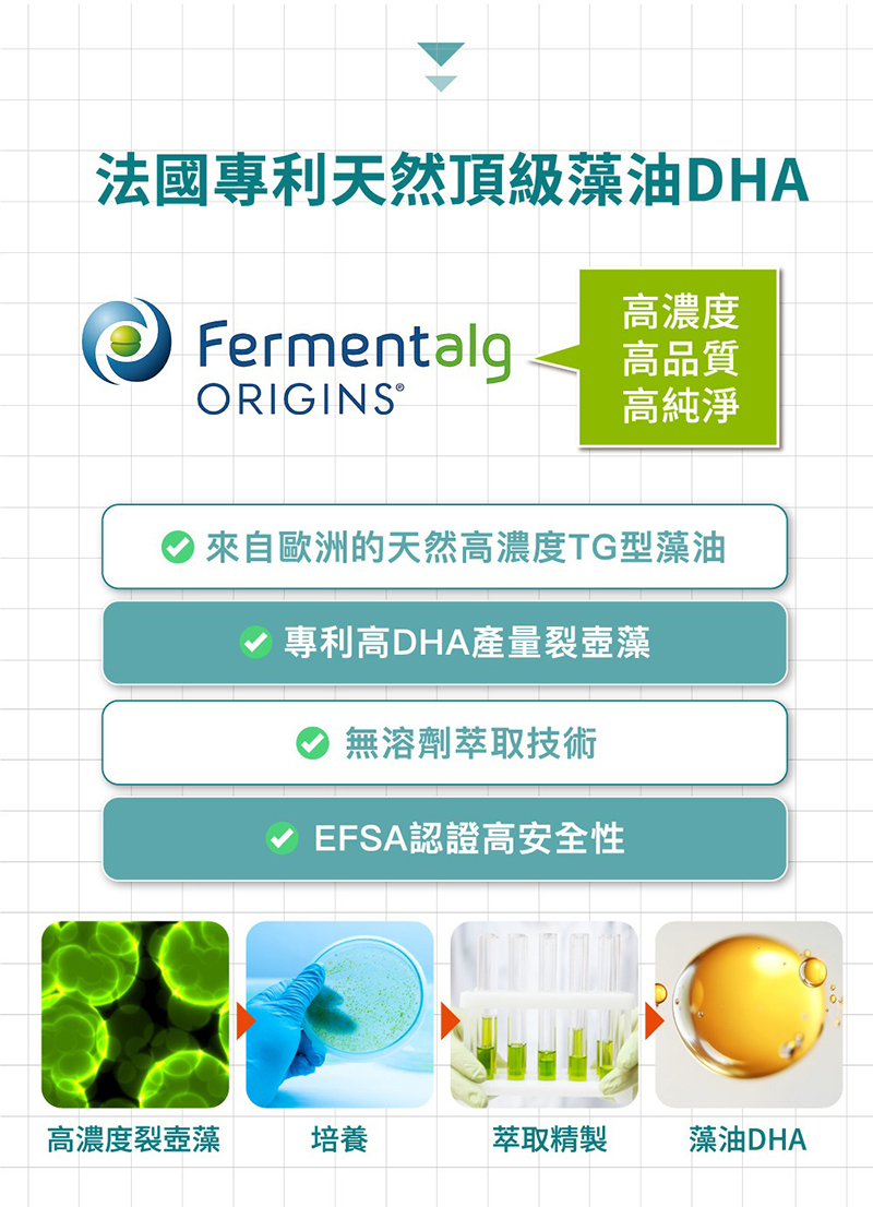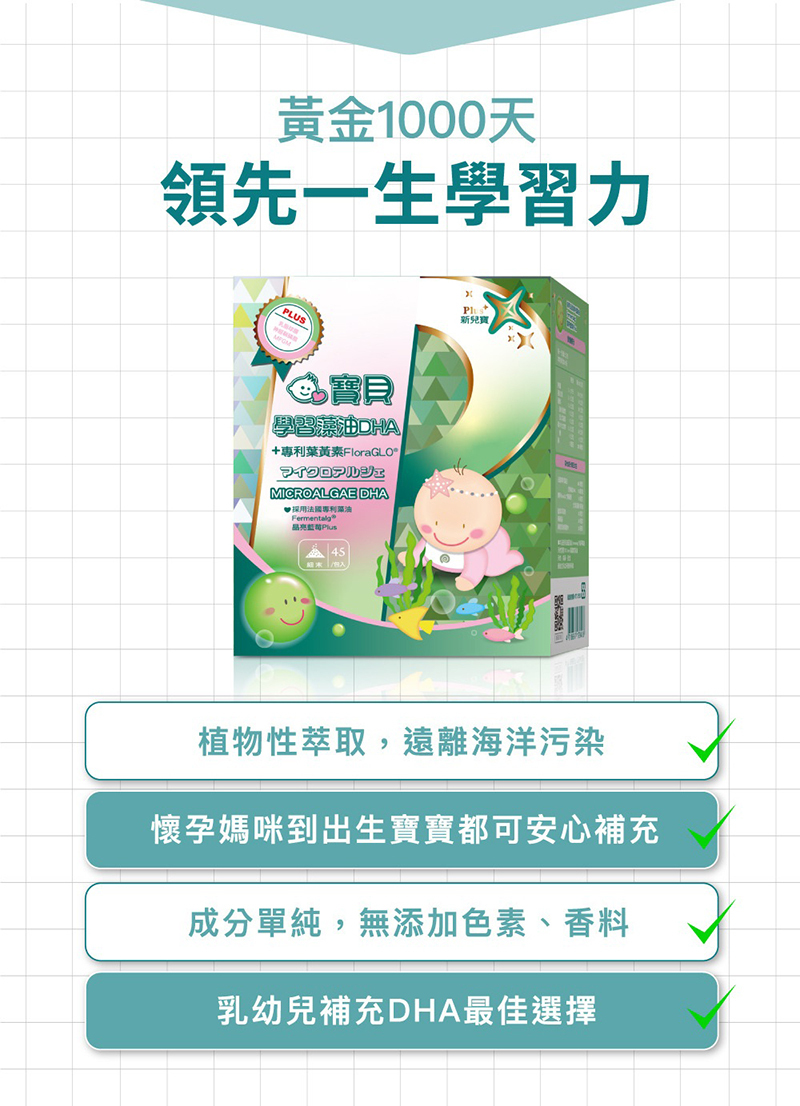 植物性萃取,遠離海洋汙染,成分單純,無添加色素、香料,懷孕媽咪到初生寶寶都可以安心補充,乳幼兒補充DHA最佳選擇,讓寶貝黃金1000天領先一生學習力!