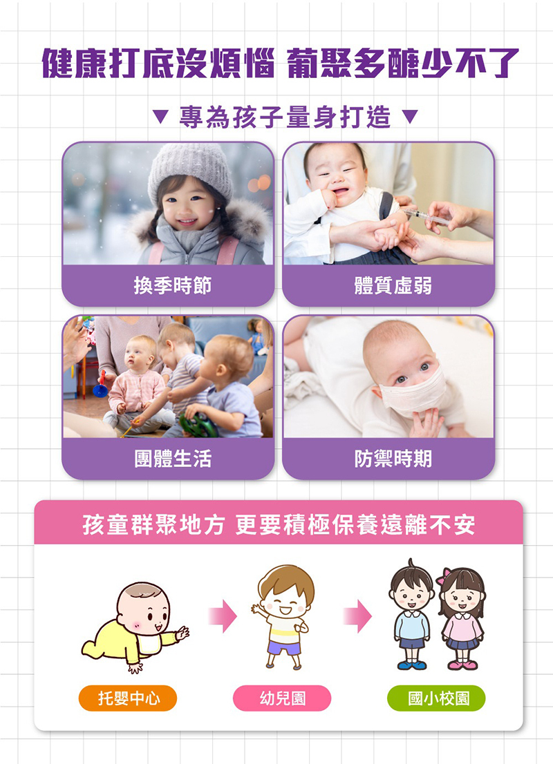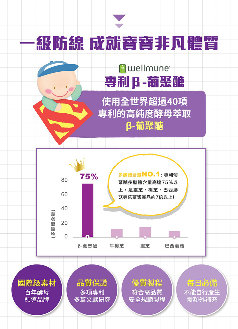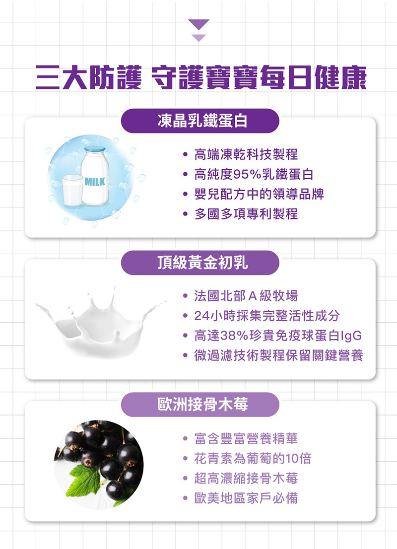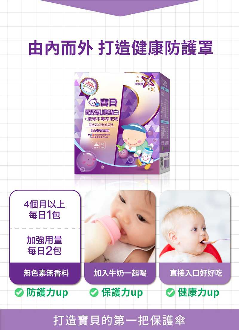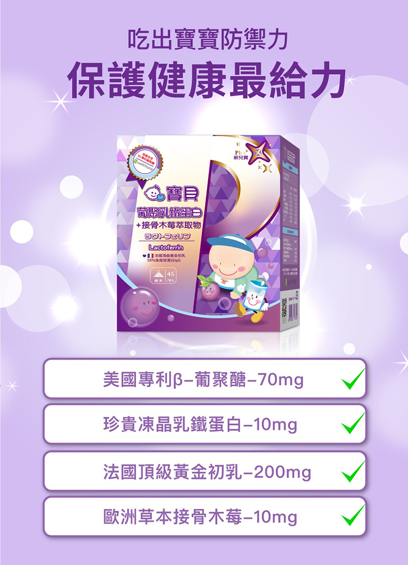 每日2包含美國專利β-葡聚醣70毫克、珍貴凍晶乳鐵蛋白10毫克、法國頂級黃金初乳200毫克、歐洲草本接骨木莓10毫克,吃出寶寶防禦力,保護健康最給力。