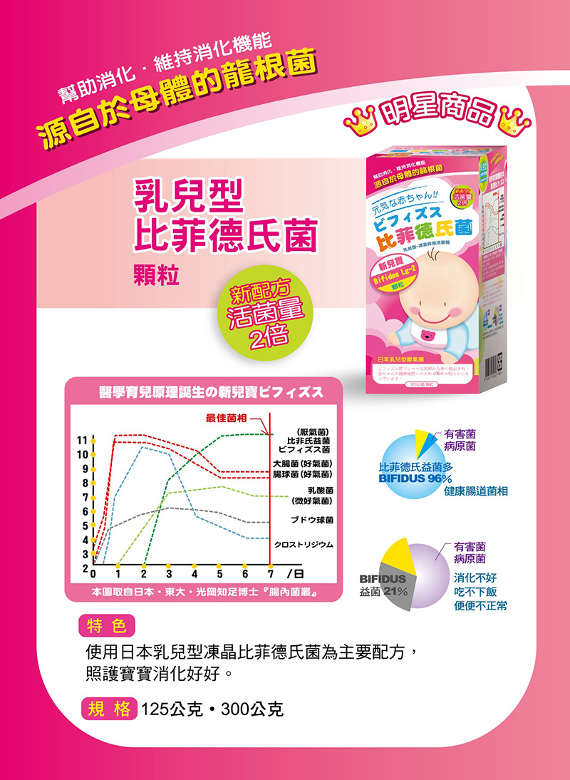 使用日本乳兒型凍晶比菲德氏菌為主要配方,照護寶寶消化好好。