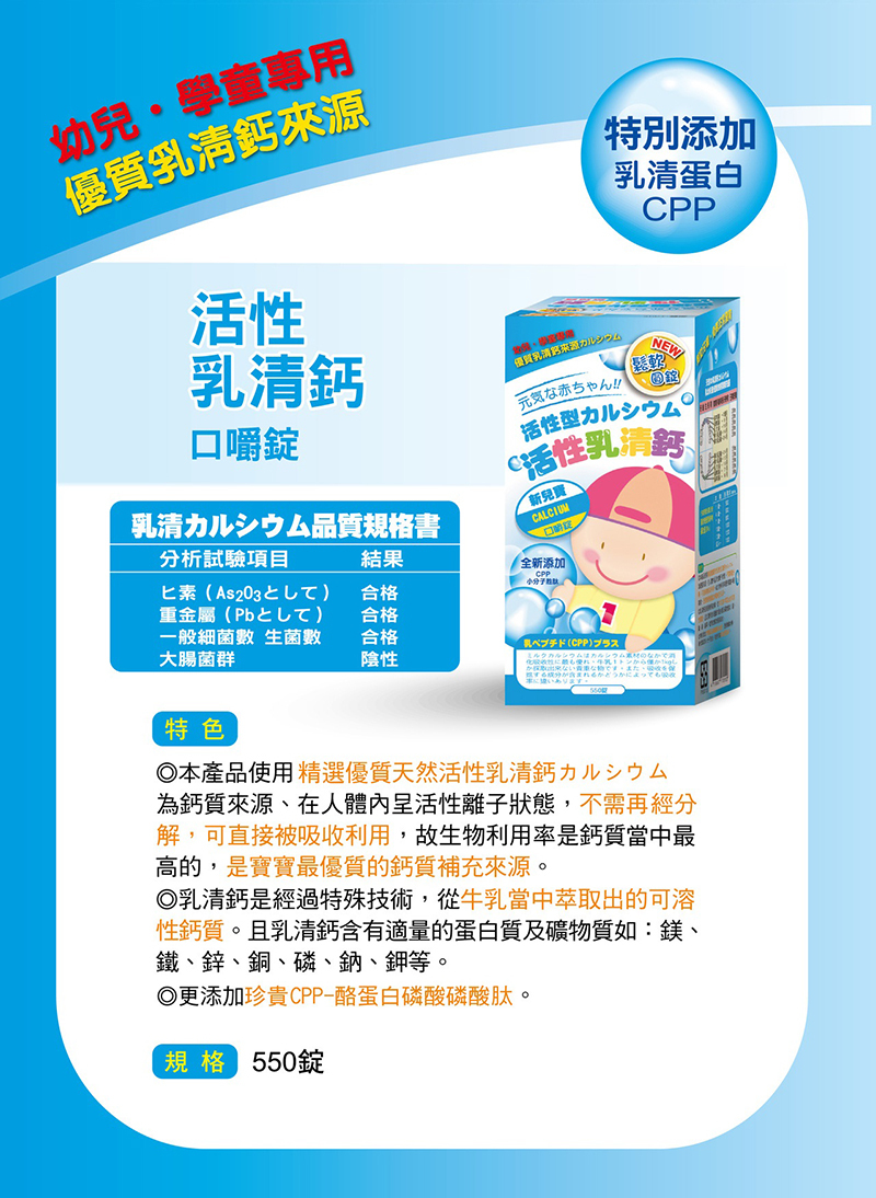精選優質天然活性乳清鈣,不需再經分解,可直接被吸收利用,是寶寶最優質的鈣質補充來源。