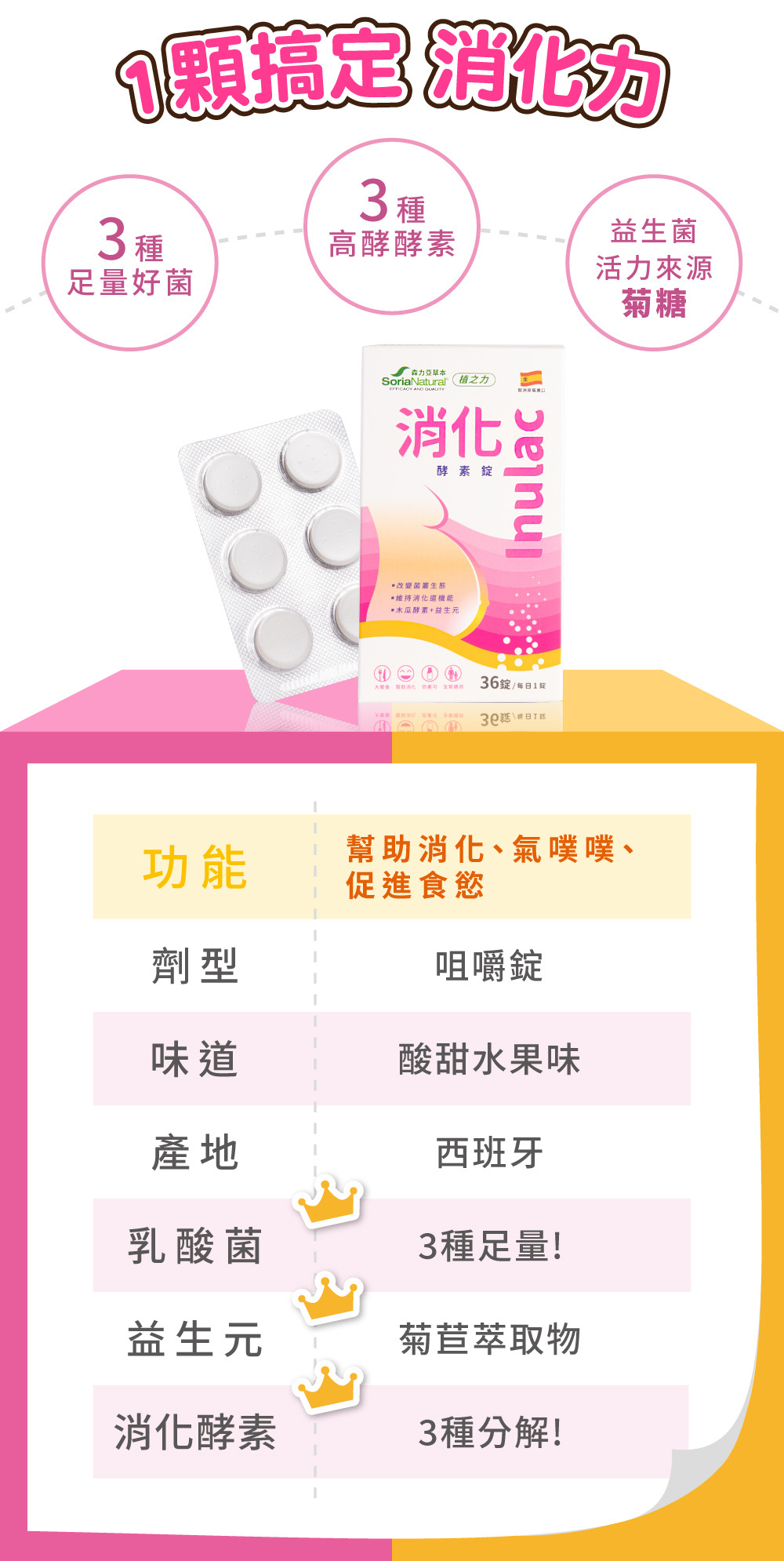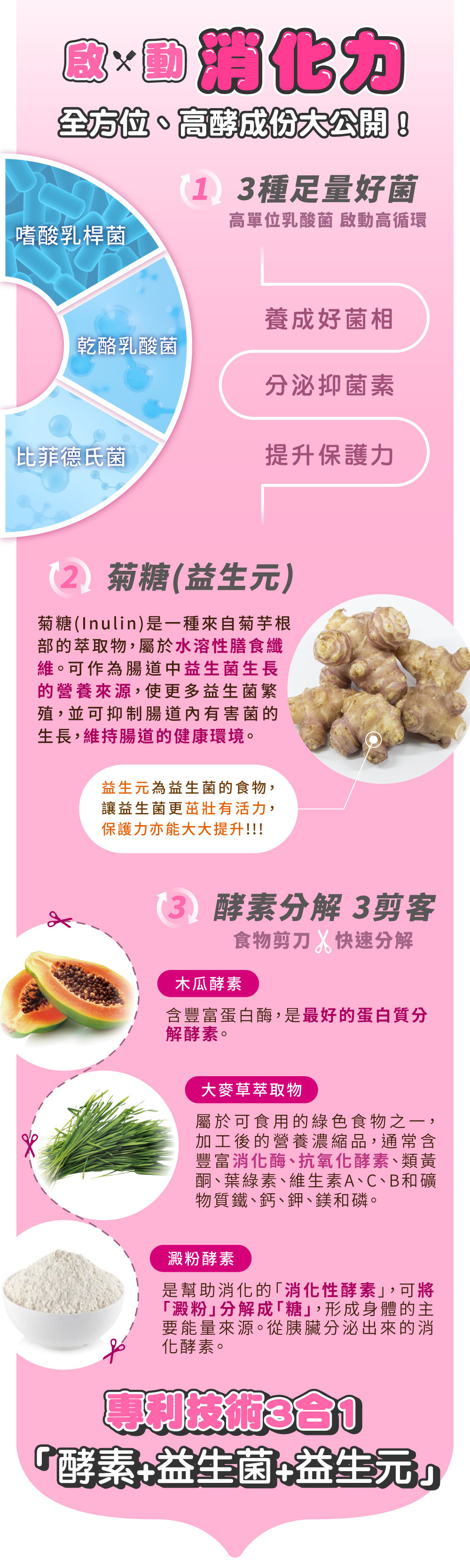 | ● | 獨有3合1配方 酵素+益生菌+益生元 |