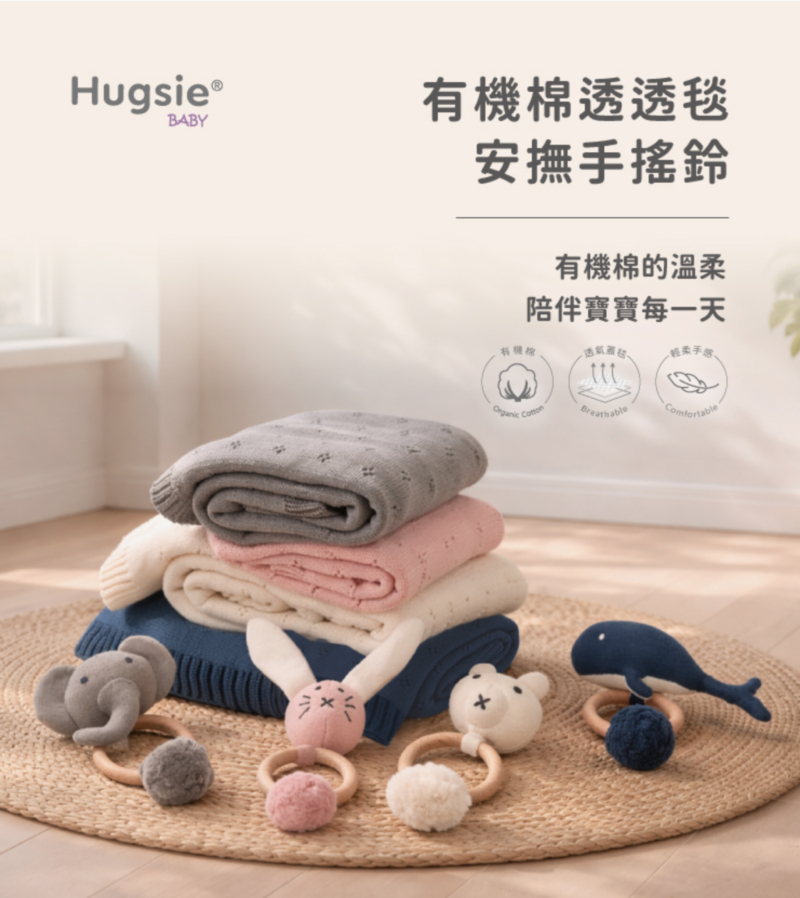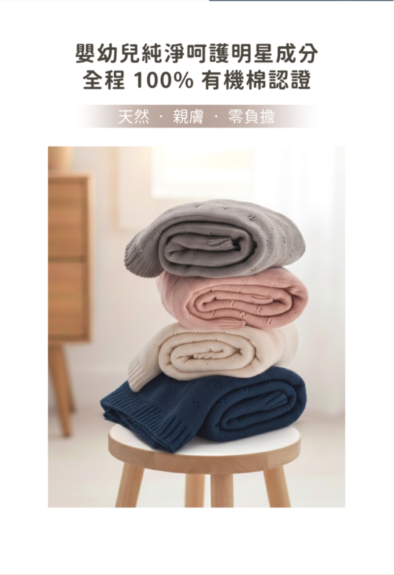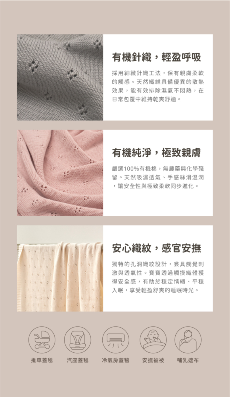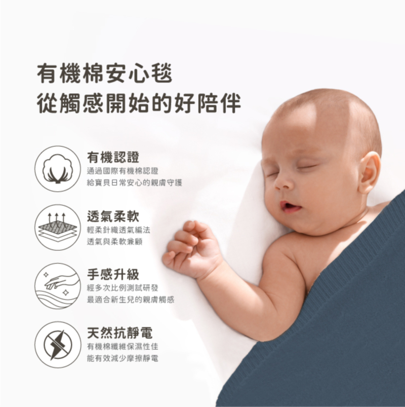 100%有機棉針織毯,親膚柔軟、透氣不悶熱
