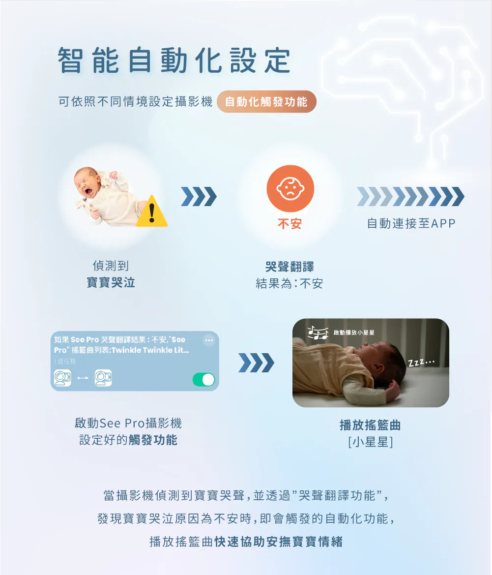 內建搖籃曲 & 白噪音:偵測情境自動播放 幫助寶寶安穩入睡 |