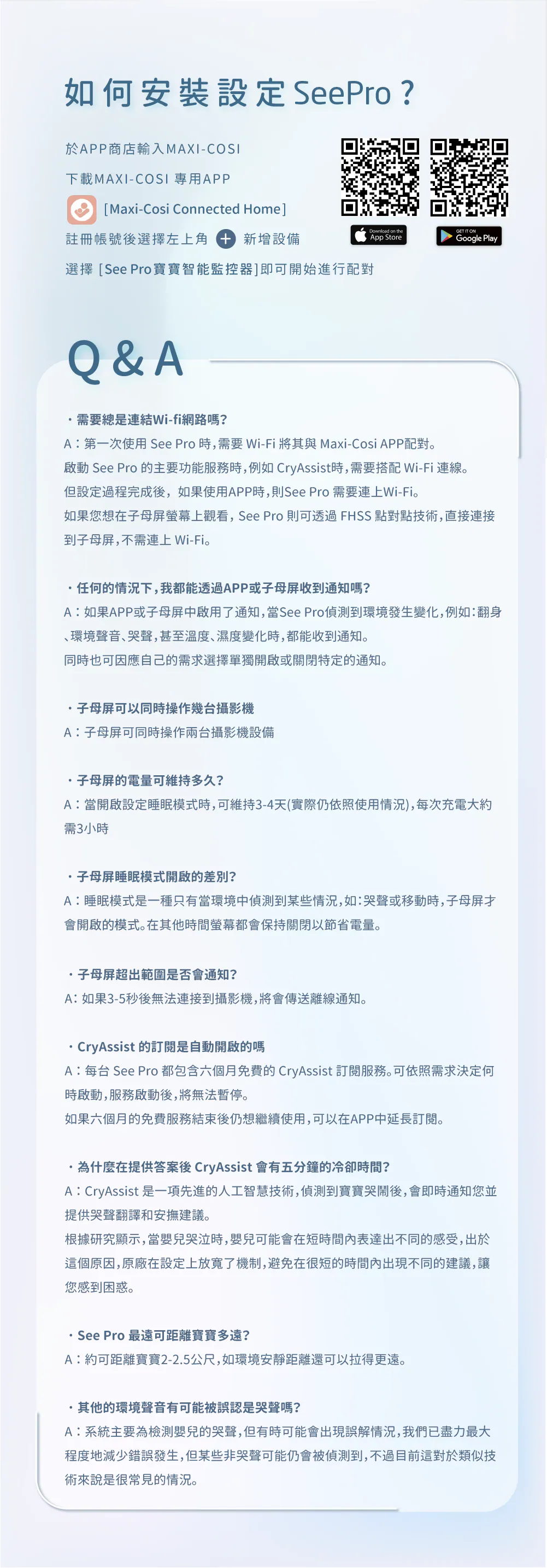 本商品為非以有形媒介提供之數位內容一經提供即為完成之線上服務,一經您事先同意後始提供者,依消費者保護法19 條及通訊交易解除權合理例外情事適用準則條第二項之規定,您只要啟動Seepro寶寶智能監控器於MAXI-COSI APP進行設備配對/雲端儲存/CryAssist(哭聲翻譯偵測)功能任一項,將無法享有鑑賞期之權益,且不得辦理退貨退款。